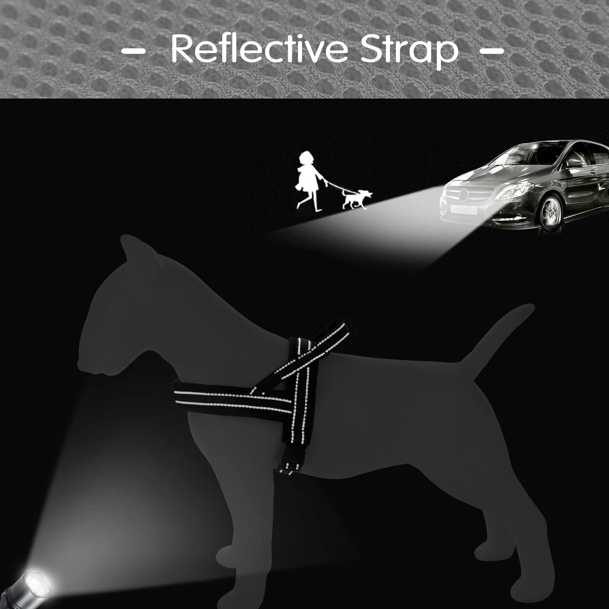 Q: How does the harness prevent pulling and choking?A: The harness features a front D-ring that is welded for durability, which effectively reduces pulling and prevents choking. This design allows for better control during walks, ensuring a safer experience for both you and your dog.