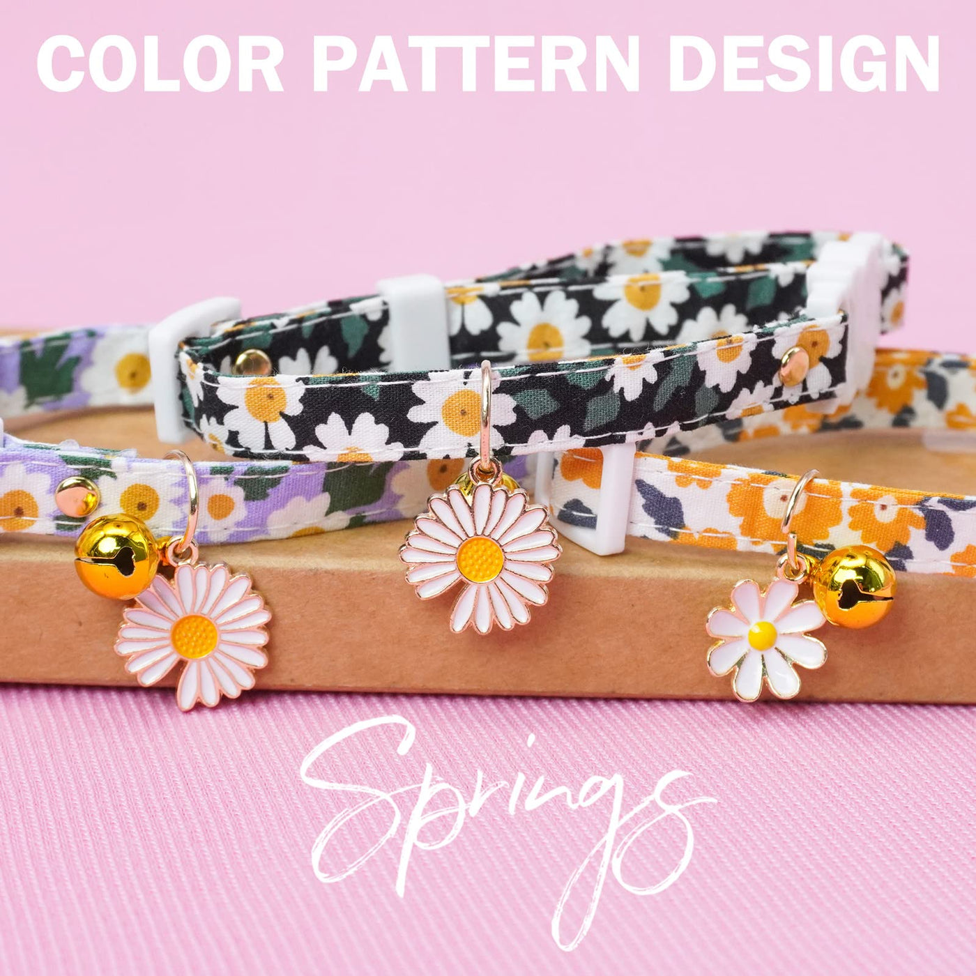 Dillybud 3 Pack Breakaway Cat Collars With Bell- Flower Pendant Spring Cat Collar For Girl Boy Cats With Safety Buckle- Cute Kit