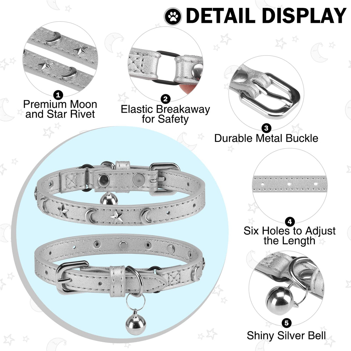Dillybud Leather Cat Collars For Boy Girl Cats With Bell And Safety Elastic Belt, Personalized Star And Moon Stud Adjustable Saf