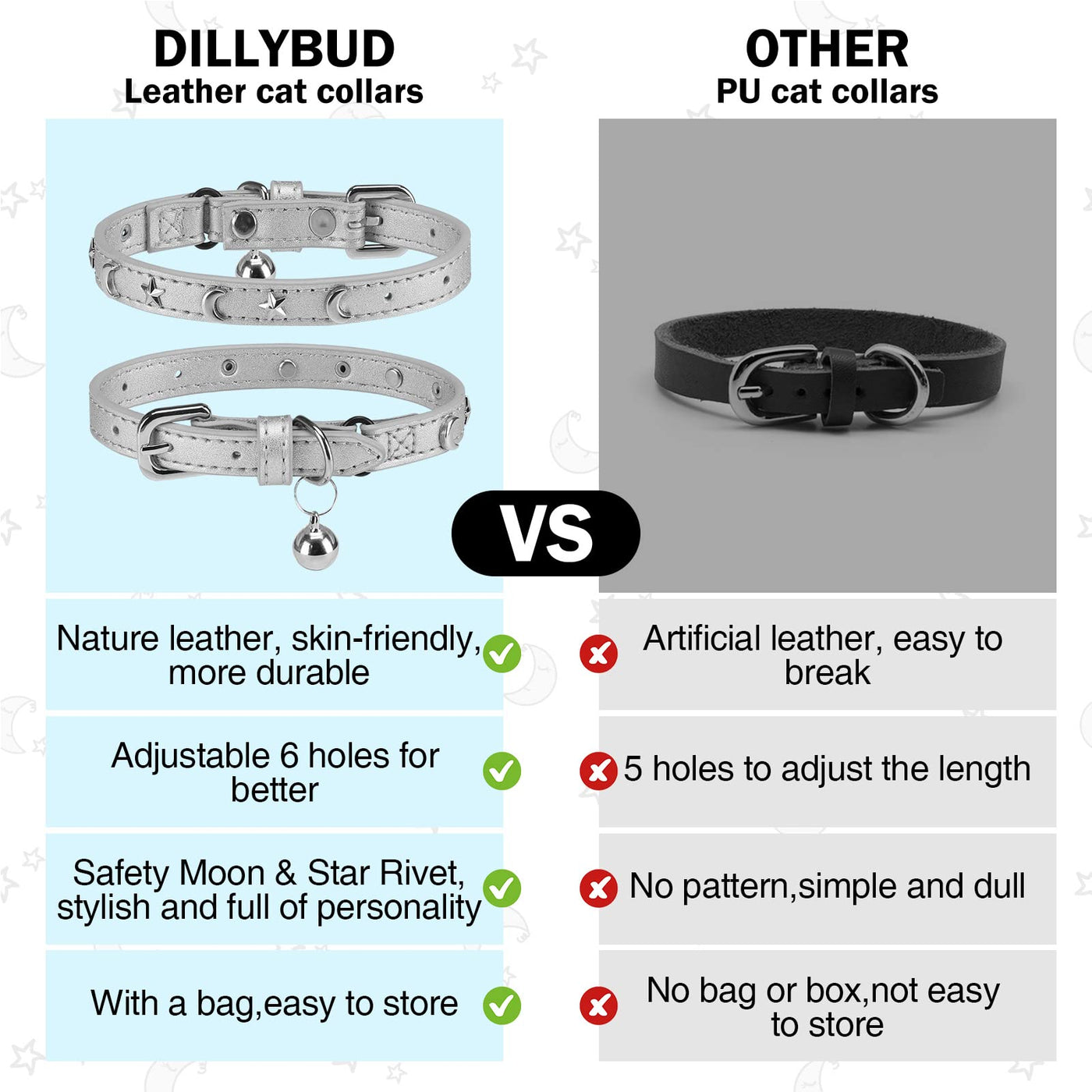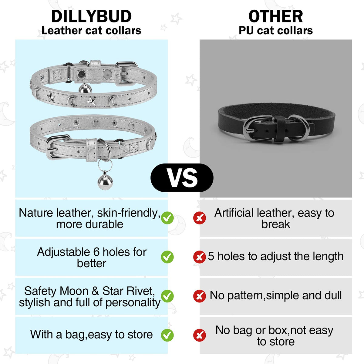 Dillybud Cat Collar Is Specifically Designed For Small To Medium-Sized Pets, Made With Premium Materials And Professional Craftsmanship, Making It Lightweight And Durable. The Unique Moon And Star Studs Are Fixed On Genuine Leather, Making The Cat Collar Stylish And Fashionable. The Pet Collar Also Has A Safety Design, Allowing You To Confidently Put It On Your Small Cats And Dogs. The Solid Color Collar Matched With Silver Decorations Is Versatile, Classic, And Elegant, Making Your Furry Friend The Center Of Attention. Multiple Colors Are Available, Making It The Best Gift For Your Beloved Pet.