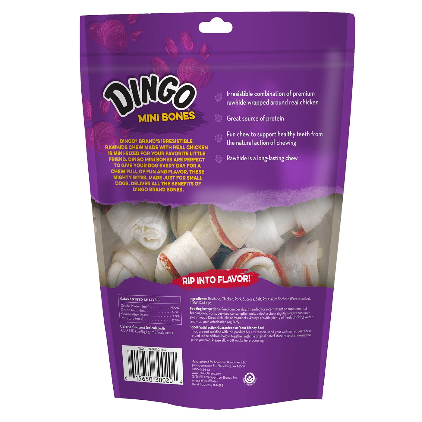 The Dingo brand combines powerful flavors and benefits to create bones, chews and treats that are sure to keep you and your dog wanting more. With a wide variety of shapes and flavors, there are options for any size companion. Dingo brands irresistible rawhide chew made with real chicken is mini-sized for your favorite little friend. Dingo mini bones are perfect to give your dog every day for a chew full of fun and flavor. These mighty bites, made just for small dogs, deliver all the benefits of Dingo brand bones. Packed with protein, these chews also promote clean teeth from the natural action of chewing. Your dog will love the combination of real chicken wrapped with premium rawhide in a classic bone shape. No fillers or artificial binders are used. Give your pup a treat you both can love! Dingo Mini Bones are the perfect size for small or toy sized dogs.