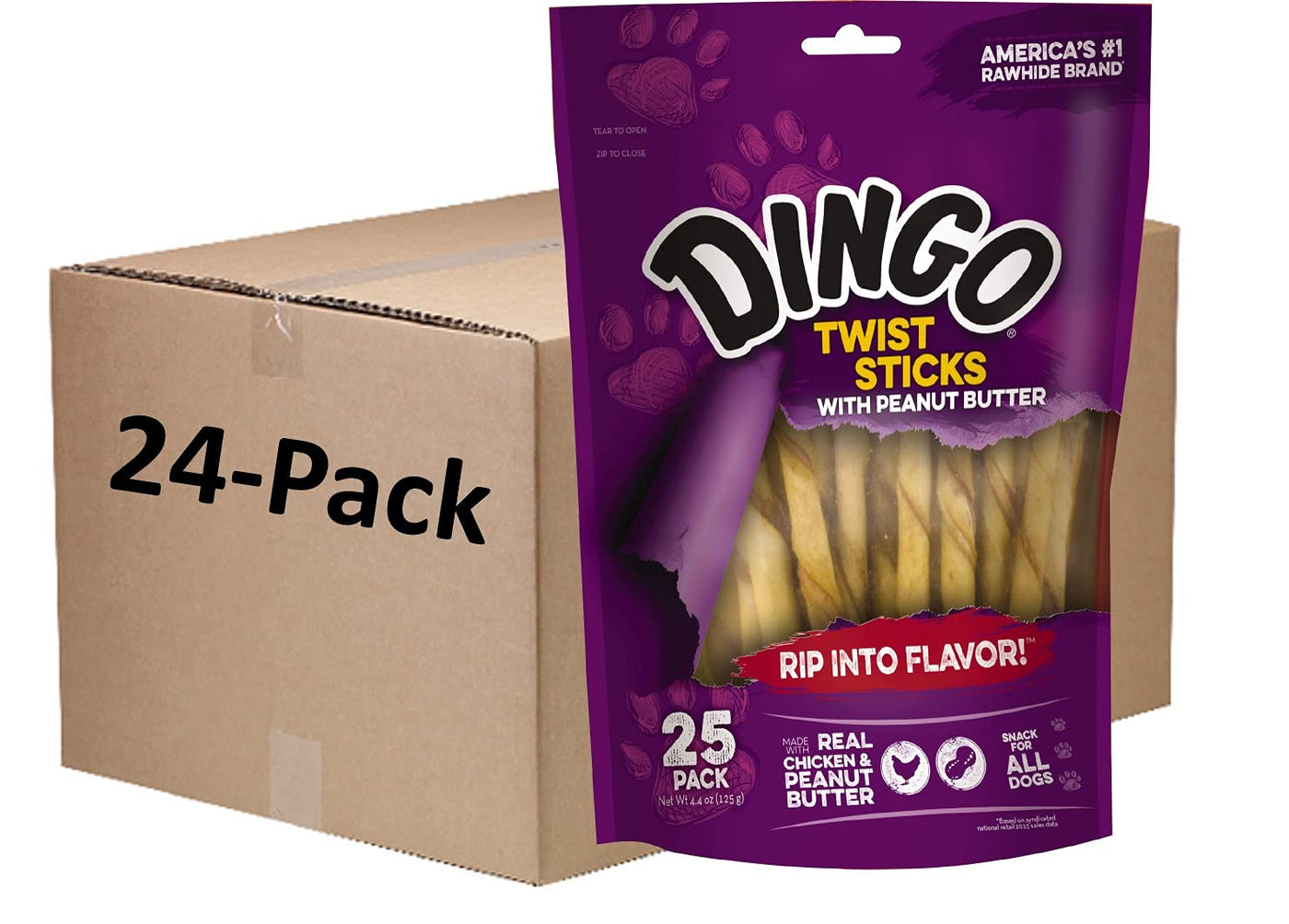Dingo Peanut butter twist sticks are made with real chicken and premium rawhide combined with peanut butter. Your pup will love the playful shape and big flavor that this treat offers. Promote clean teeth from the natural action and chewing while providing a great source of protein.