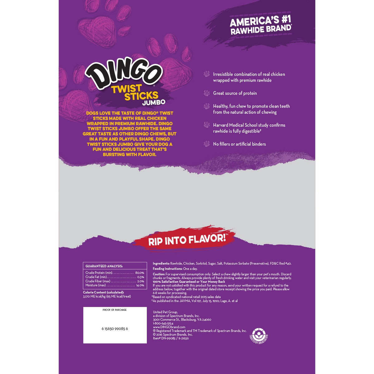 DescriptionThe Dingo brand combines powerful flavors and benefits to create bones, chews and treats that are sure to keep you and your dog wanting more. With a wide variety of shapes and flavors, there are options for any size companion. Dogs love the taste of Dingo Twist Sticks made with real chicken wrapped in premium rawhide. Dingo Twist Sticks Jumbo offer the same great taste as other Dingo chews, but in a fun and playful shape. Dingo Twist Sticks Jumbo give your dog a fun and delicious treat thats bursting with flavor. The tasty combination of real chicken wrapped with premium rawhide provides your pup with a good source of protein. Each healthy, fun chew also promotes clean teeth from the natural action of chewing, so you can love them too!Each pack contains 9 chews, great for any size dog. Select a chew slightly larger than your pets mouth and discard chunks or fragments. Feed one a day and always provide fresh drinking water to your dog.