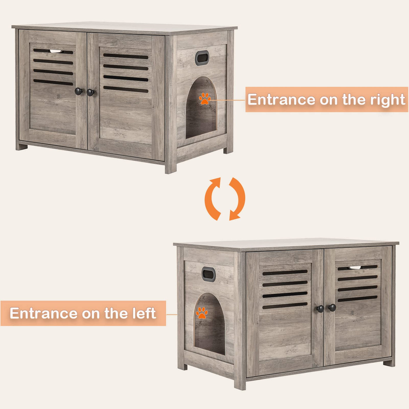 DINZI LVJ Hidden Cat Litter Box Furniture with Louvered Doors, Indoor Cat House Nightstands, Side Table, End Table for Living Room, Bedroom, Entryway. Stylish Decorative Pet Home & Enclosed Litter Box Why Do Your Need It? Cats are sensitive and hyper-vigilant, which makes them accustomed to burying their poo. The act of toileting is when they are at their most vulnerable and so look for a safe and private location. This is the meaning of the pet washroom, providing a stress free and private environment for your kitty. Multi-purpose Furniture Serve as litter box cabinet, decorative cat house, nightstand, side table, end table, bed-end stool and more. Only need some magazines, books, plants, coffee and lamp, you can easily create an eye-catching and cozy area. DINZI LVJ Notes: Please do not allow children play in this kitty litter box furniture. Always Be Eye-catching The elegant shape and fashionable color rejuvenate the place that once troubled you. Add an artistic atmosphere to your home and enriching your furniture decoration. Blend in with your home decor in living room, bedroom, entrance, etc. Good Ventilation As one of our family members, a clean and healthy environment is essential for the cat to play and rest. Thus, it is necessary to keep the wood cat house well ventilated. With this in mind, DINZI LVJ has carefully designed the louvered door, so that your cat can enjoy the fresh air while resting and playing. Double-Door with Magnet The magnetic double-door design provides convenience for cleaning the internal space and replacing the cat litter. The exquisite handles allow you to open and close the door with ease. DIY Your Entrance Side Before assembling, please determine which side of the entrance is better for you and your cat. We have designed two methods to build it up based on your preference for the entrance direction.