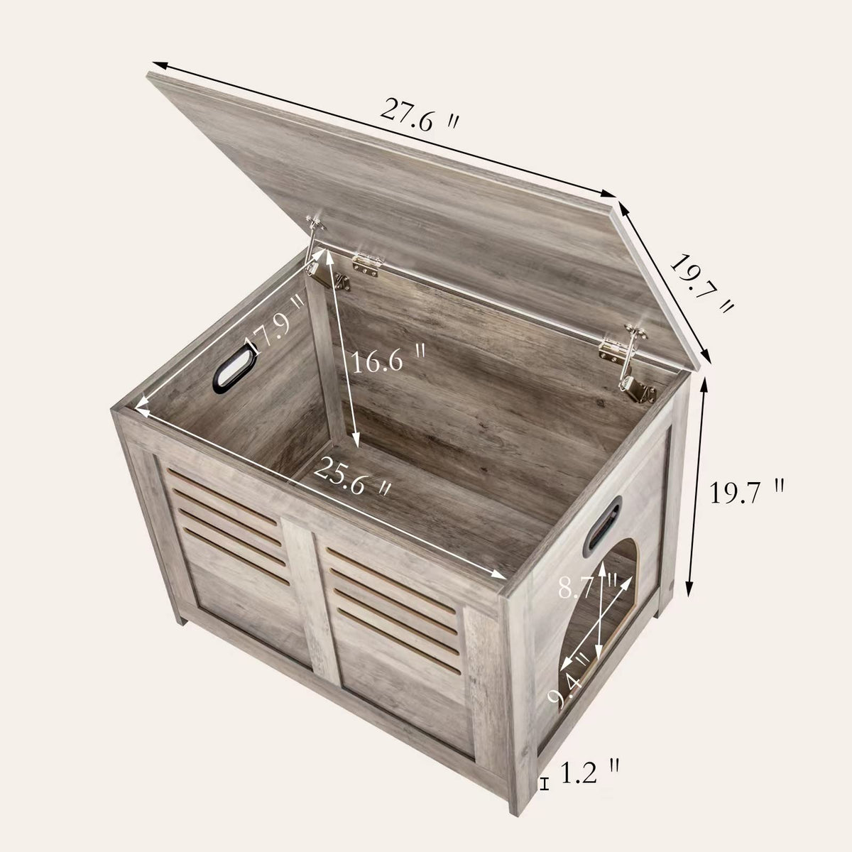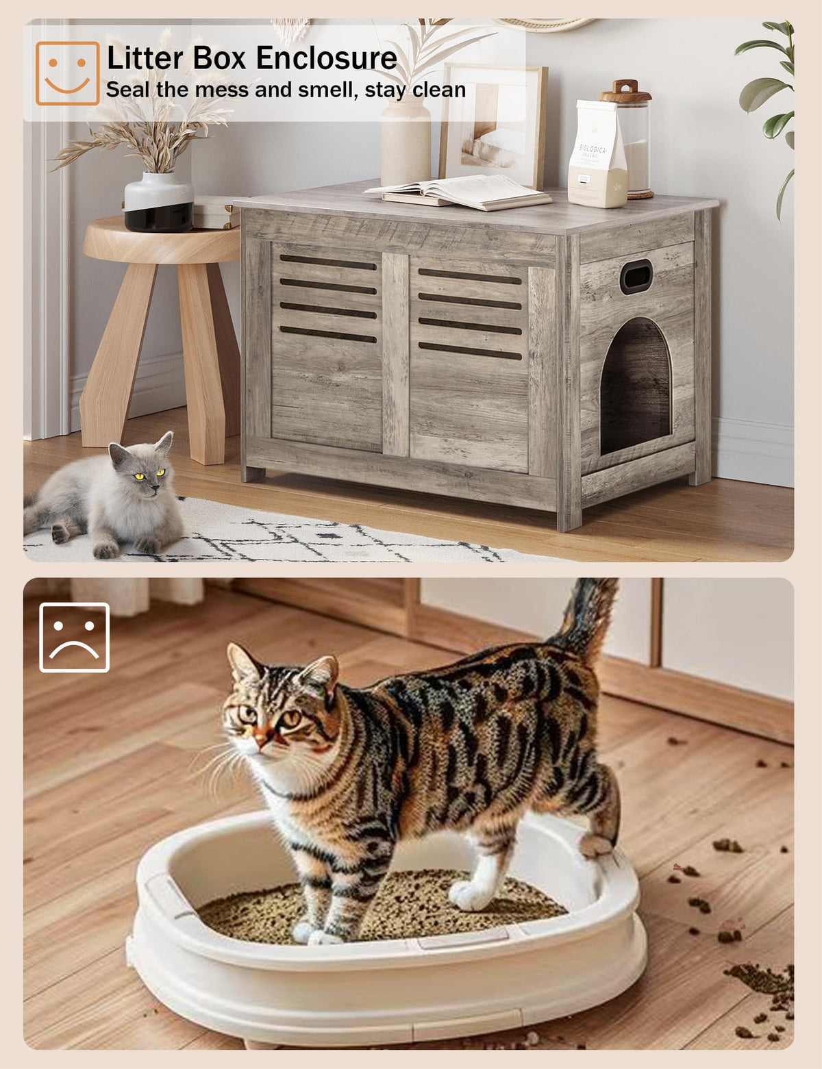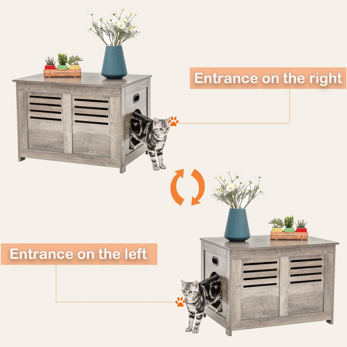 Dinzi Lvj Hidden Cat Litter Box Enclosure With Flip Top Lid, Good Ventilation, Indoor Wooden Cat House, Cat Washroom And Side End Table For Living Room, Bedroom, Entryway. Easy Assembly Litter Box Furniture Stylish Decorative Pet Home & Enclosed Litter Box. Why Do Your Need It? Cats Are Sensitive And Hyper-Vigilant, Which Makes Them Accustomed To Burying Their Poo. The Act Of Toileting Is When They Are At Their Most Vulnerable And So Look For A Safe And Private Location. This Is The Meaning Of The Pet Washroom, Providing A Stress Free And Private Environment For Your Kitty. Multi-Purpose Furniture:It Is A Multifunctional Cat Furniture, Can Be Used As Litter Box Cabinet, Decorative Cat House, Nightstand, Side Table, End Table, Bed-End Stool And More. The Whole Family Benefits:The Litter Box Enclosure Is Essential To Keep The Cat Litter From Being Scattered Everywhere. It Also Provides A Barrier That Reduces The Diffusion Of The Unpleasant Smells Into The Living Space. Flip Lid Makes Daily Clean And Cat Care Effortless Always Be Eye-Catching:The Elegant Shape And Fashionable Color Rejuvenate The Place That Once Troubled You. Add An Artistic Atmosphere To Your Home And Enriching Your Furniture Decoration. Blend In With Your Home Decor In Living Room, Bedroom, Entrance, Etc. Good Ventilation: As One Of Our Family Members, A Clean And Healthy Environment Is Essential For The Cat To Play And Rest. Thus, It Is Necessary To Keep The Wood Cat House Well Ventilated. With This In Mind, Dinzi Lvj Has Carefully Designed The Louvered Door, So That Your Cat Can Enjoy The Fresh Air While Resting And Playing. Flip-Top Lid With 2 Safety Hinges: This Pet Litter Box Furniture Is Equipped With 2 Hinges For Extra Safety. The Lift Top Can Be Stopped At Any Position, Opens And Closes Softly And Smoothly For Your Effortless Replacing Litters. Cat Entrance Can Be On Left Or Right: Before Assembling, Please Determine Which Side Of The Entrance Is Better For You And Your Cat. We Have Designed Two Methods To Build It Up Based On Your Preference For The Entrance Direction. 2 Built-In Handles: This Wood Kitty Litter Box Cover Has Built-In Handles On Both Sides, Facilitating Smooth Moving Across The Room. Specifications: - Color: Greige - Material: Particle Board - Product Size: 27.6''L X 19.7''W X 19.7''H (70 X 50 X 50 Cm) - Max. Static Load Capacity Of The Top: 132 Lb (60 Kg) - Max. Static Load Capacity Of The Bottom: 66 Lb (30 Kg) Package Contents: - 1 X Litter Box Enclosure - 1 X Assembly Kit - 1 X Instructions Dinzi Lvj Notes: - The Max. Static Load Capacity Of The Top Is 132 Lb (60Kg), Do Not Overload It. - Please Do Not Allow Children Play In This Wood Cat Litter Box. - Do Not Step Or Sit On The Product.
