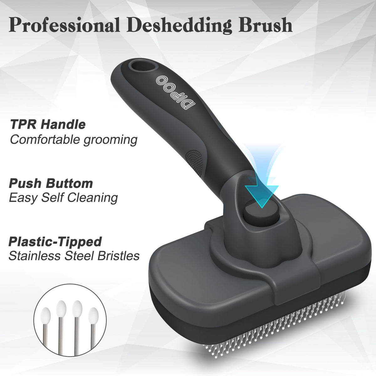 Q: How does the Dipoo Self-Cleaning Deshedding Brush work?A: The Dipoo Self-Cleaning Deshedding Brush features a release button that allows you to easily remove collected hair from the brush after each use. This design helps to minimize shedding by efficiently grooming both long and short-haired pets.