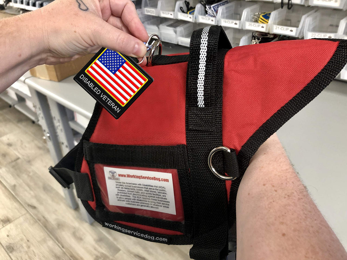 Disabled Veteran' - Service Dog Clip On Identification Hanging Patch Tag Dimensions: This Clip On Service Dog Patch Tag Measures 3.25 Wide And 4.25 Tall With The Clip. This Tag Is Double Sided. Application: The Clip On Disabled Veteran Tag Clips Onto A Larger Dogs Collar, A Service Dog Vest, Harness, Leash, Bag Or A Carrier. It Is Easily Removed When Not In Use. Patriotic: Show Your Pride In The Usa - Beautiful Embroidered Full Color American Flag. Highly Visible: This Double Sided Disabled Veteran Embroidered Patch Tag Features Bold Text That Is Easy To Read Up Close Or Far Away. The Words 'Disabled Veteran' On It In Bold Letters With A Black Background. It Features Finished Edges Which Are Bound In Black Thread. Also Embroidered Is A Full American Flag. Clear Message: These Clip On Tags Are Designed To Inform The Public That Your Dog Is A Autism Service Dog. Working Service Dog Is An Official Manufacturer Of Service Dog Equipment Located In The Usa.