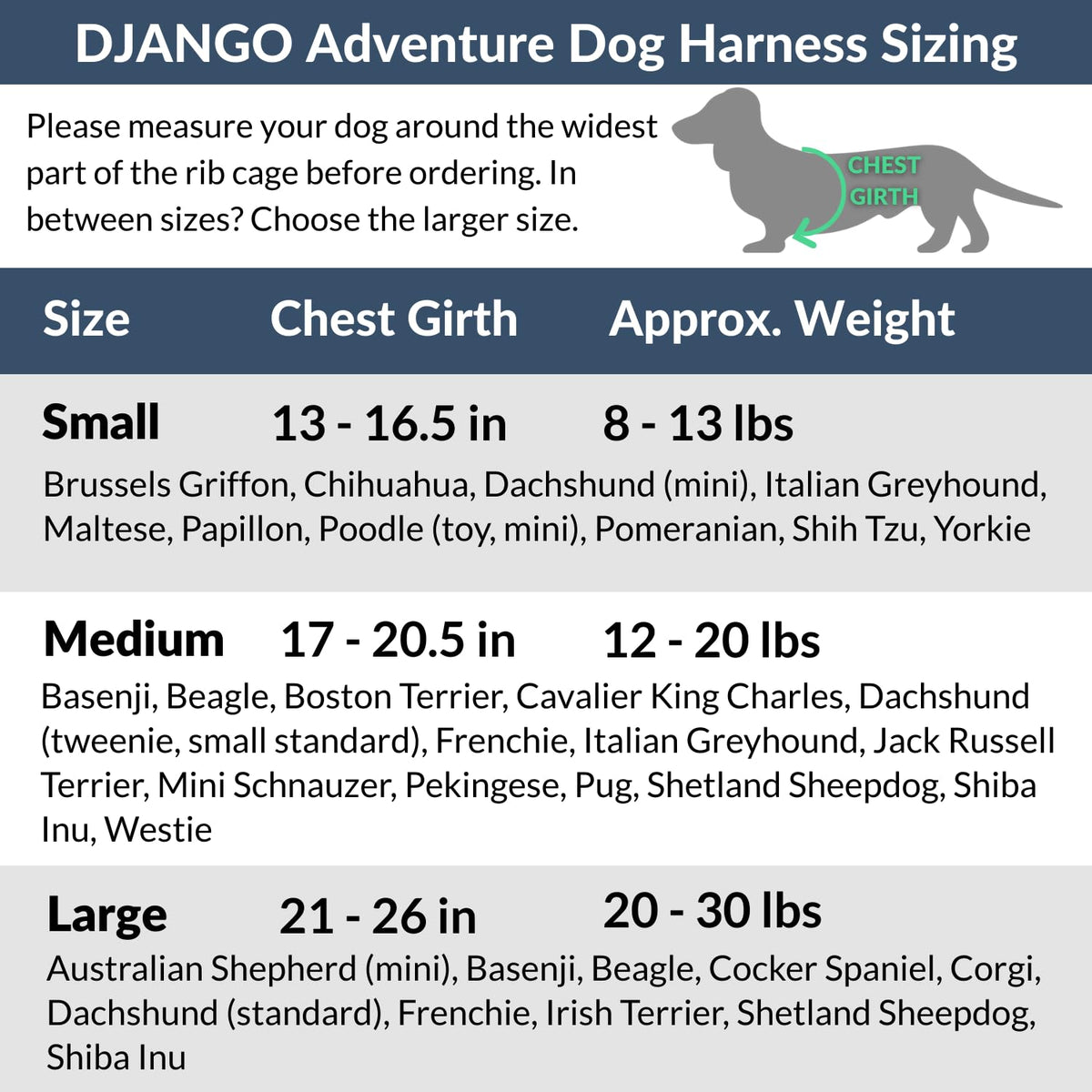 Take your dog on unforgettable adventures with the ???????????? Adventure Dog Harness. This premium neoprene dog harness is designed for comfort, durability, and safety-making it the perfect dog accessory for rugged adventures and everyday use. Crafted from high-quality, weather-resistant neoprene, the stylish pet harness is padded for your dogs comfort and lined with breathable performance mesh to keep your pet cool during warm-weather months. Whether youre exploring rugged trails or strolling down the sidewalk, the harness ensures maximum comfort and security. The solid brass hardware adds durability and a touch of style, while reflective trim enhances visibility in low-light conditions, keeping your dog safe on early morning and evening walks. Featuring four points of adjustment, the escape-proof dog harness provides a custom fit for all dog sizes and builds, ensuring that your pet wont slip out. The harness narrow, deep body prevents chafing, particularly around the armpits, so your dog can move freely. With easy-on, easy-off side-release buckles, this small dog harness is hassle-free to use, even with the most energetic dogs. Pair it with the DJANGO Adventure Dog Leash for a stylish, cohesive look. Features: Weather-resistant neoprene for all-weather outdoor adventures. Padded neoprene harness body offers a comfortable fit for your dog. Breathable performance mesh lining keeps dogs cool. Solid brass hardware ensures durability and resists corrosion. Reflective trim enhances visibility during low-light walks. Four adjustable points for a custom fit on all dogs. Secure and easy on/off buckles for hassle-free use. Anti-chafing design prevents rubbing around sensitive areas. Perfect for outdoor adventures, daily walks, and everyday use. Matching leash available for a complete stylish set.