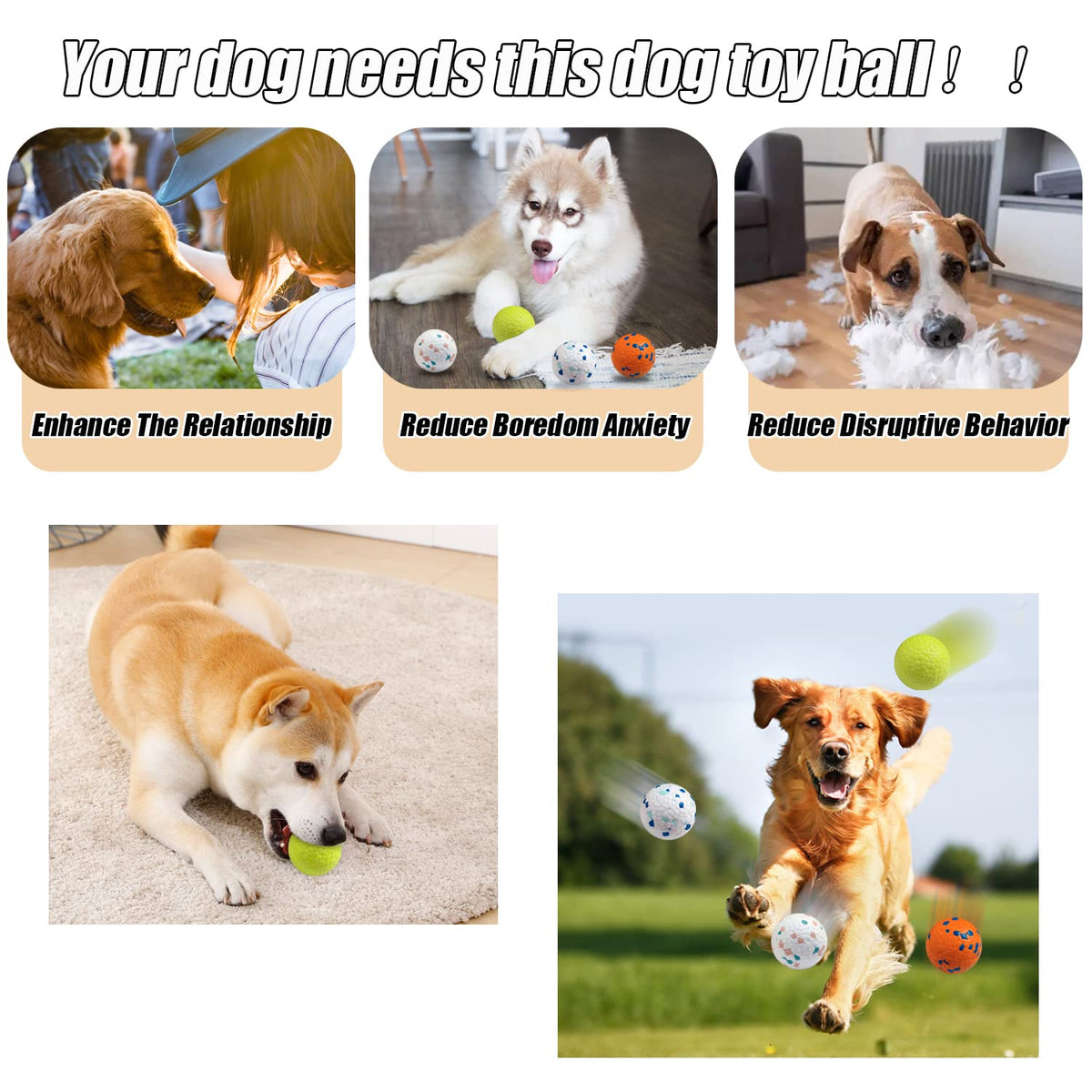 DURABLE DOG FETCH BALLS:This dog ball has a good bounce the surface of the dog ball is covered with most of the 3d raised particles which helps the dog to pick it up quickly while playing and also helps to clean the teeth. Keep your dog energetic and healthy every day. It's a great interactive dog ball for indoor and outdoor play.