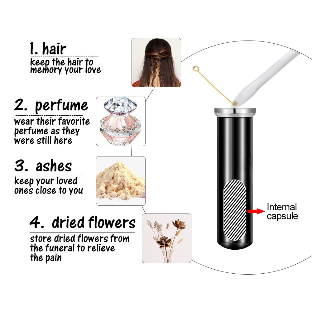 Q: How can I personalize the cremation necklace?A: You can personalize the Dletay Cylinder Cremation Jewelry Urn Necklace by adding ashes, a lock of hair, dried flowers, or special messages inside the cylinder. This allows you to create a unique keepsake that holds sentimental value and reflects your personal memories.