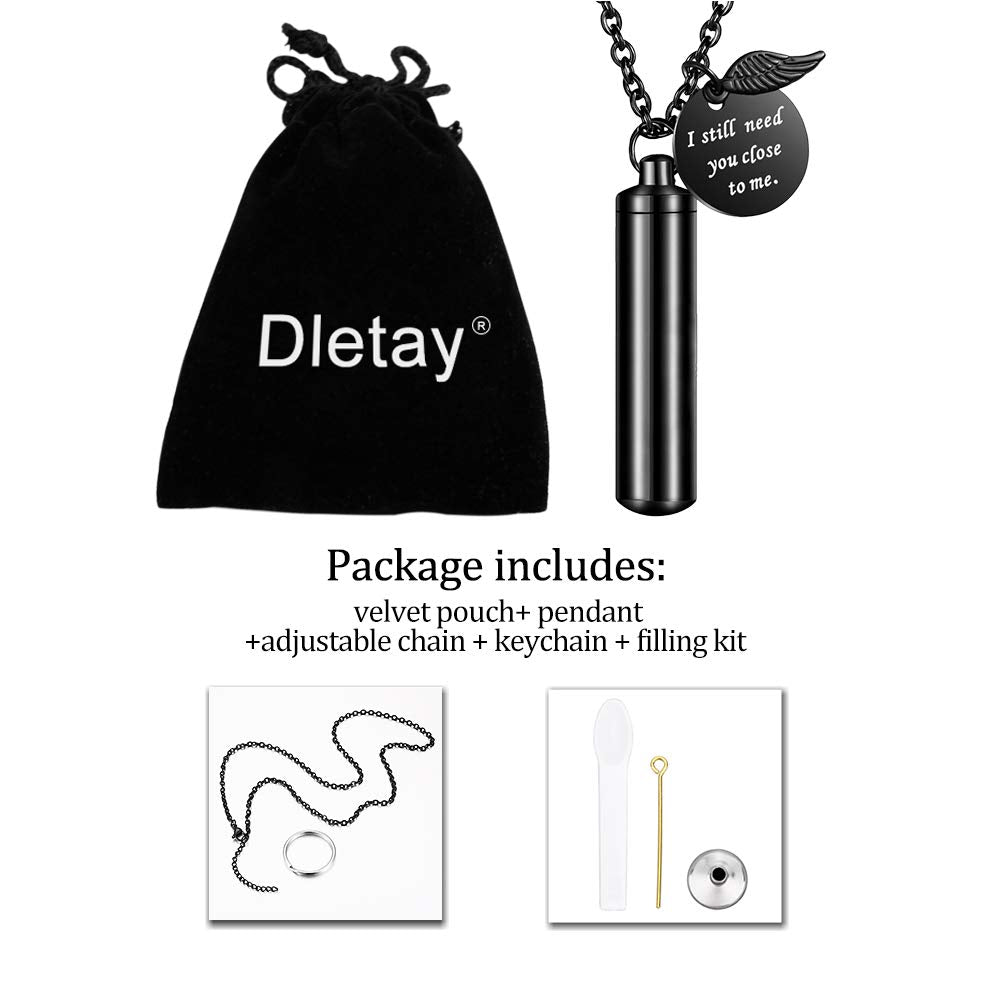 Q: What is included with the purchase of the necklace?A: The purchase of the Dletay Cylinder Cremation Jewelry Urn Necklace includes 1 pendant, 1 angel wing charm, 1 round disc, 1 keyring, 1 filling kit, and 1 black velvet pouch for safe storage. This complete set allows for personal customization and easy carrying.