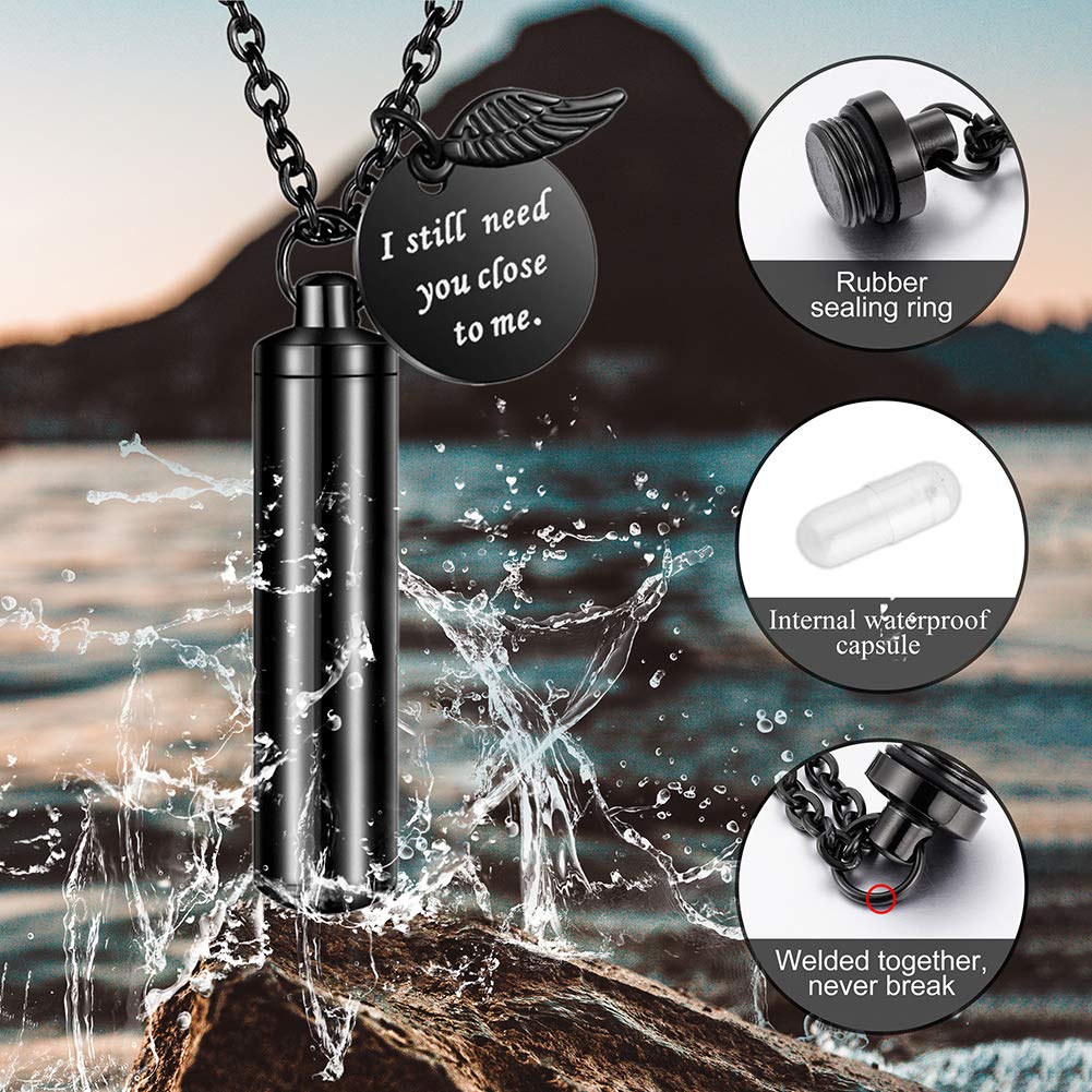 Q: How does the waterproof design of the necklace work?A: The necklace features a rubber sealing ring and an internal plastic container, which work together to keep the inside contents safe and secure from moisture. This waterproof design ensures that your cherished keepsakes, such as ashes or other mementos, remain protected.