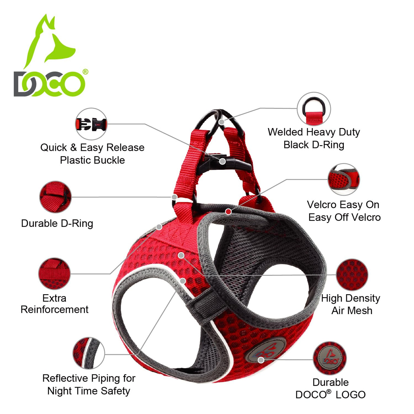 The DOCO Athletica Quick Fit Mesh Harness is a form fitting adjustable vest harness designed to provide a comfortable fit with less pressure around the neck than classic collars. Perfect for easier training and outdoor activities. The 3mm thick high dense air mesh will provide ultra comfort on your best buddys neck and chest area. The mesh harness is designed with a reflective all-over piping that reflects light for extra safety in the darkness and visibility at night. Equipped with adjustable velcro straps for easy size adjustment and customs fits for different girth sizes. The cross-stitched nylon straps allow for optimal tension distribution and protect against neck injuries. Its long lasting and fray resistant. All DOCO harnesses are designed to reduce stress, allowing weight to be distributed evenly through the chest and shoulders when your dog pulls while walking. Treat your dog to some unique designs with this series of harnesses. Available in a variety of solid and vibrant colors that are easy to see at all times. They are perfect to complete your best buddies look.