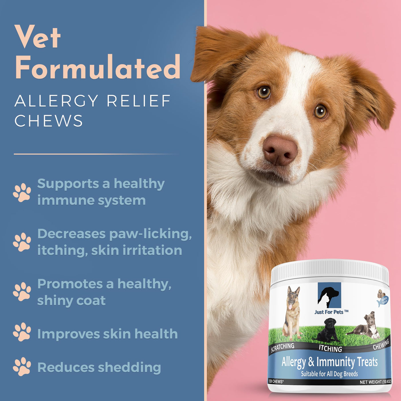 DELICIOUS & CONVENIENT CHEWS: 120 Chews for the price of 90. Just for Pets soft and tasty allergy chews support your dogs normal seasonal response to environmental irritants like pollen and grass. With turmeric and probiotics, this formula helps maintain healthy skin and supports a balanced immune response-ideal for year-round wellness.RELIEF FROM ITCHING, LICKING & SHEDDING: These chews help support a healthy skin barrier and normal shedding. Formulated to nourish your dogs skin from the inside out, they may help with seasonal sensitivities like paw licking and dry skin-promoting coat shine and comfort.IMMUNE & DIGESTIVE HEALTH BLEND: Each chew includes 2 billion CFUs of probiotics to support healthy digestion and immune function. A balanced gut helps promote nutrient absorption and supports your dogs normal response to environmental factors, contributing to overall wellness.PACKED WITH PREMIUM ALL-NATURAL INGREDIENTS: These chews combine turmeric, omega-3s, and probiotics to support your dogs skin, digestive, and immune health. This functional blend promotes a healthy inflammatory response and helps maintain normal yeast levels-supporting overall vitality.VETERINARIAN FORMULATED & USA MADE: Formulated by veterinarians and made in a USA, FDA-registered facility, our soft salmon-flavored chews are tasty and easy to digest, theyre ideal for daily use by dogs of all breeds and sizes. Rest assured, your dog is receiving premium-quality care, free from GMOs, fillers, and preservatives.