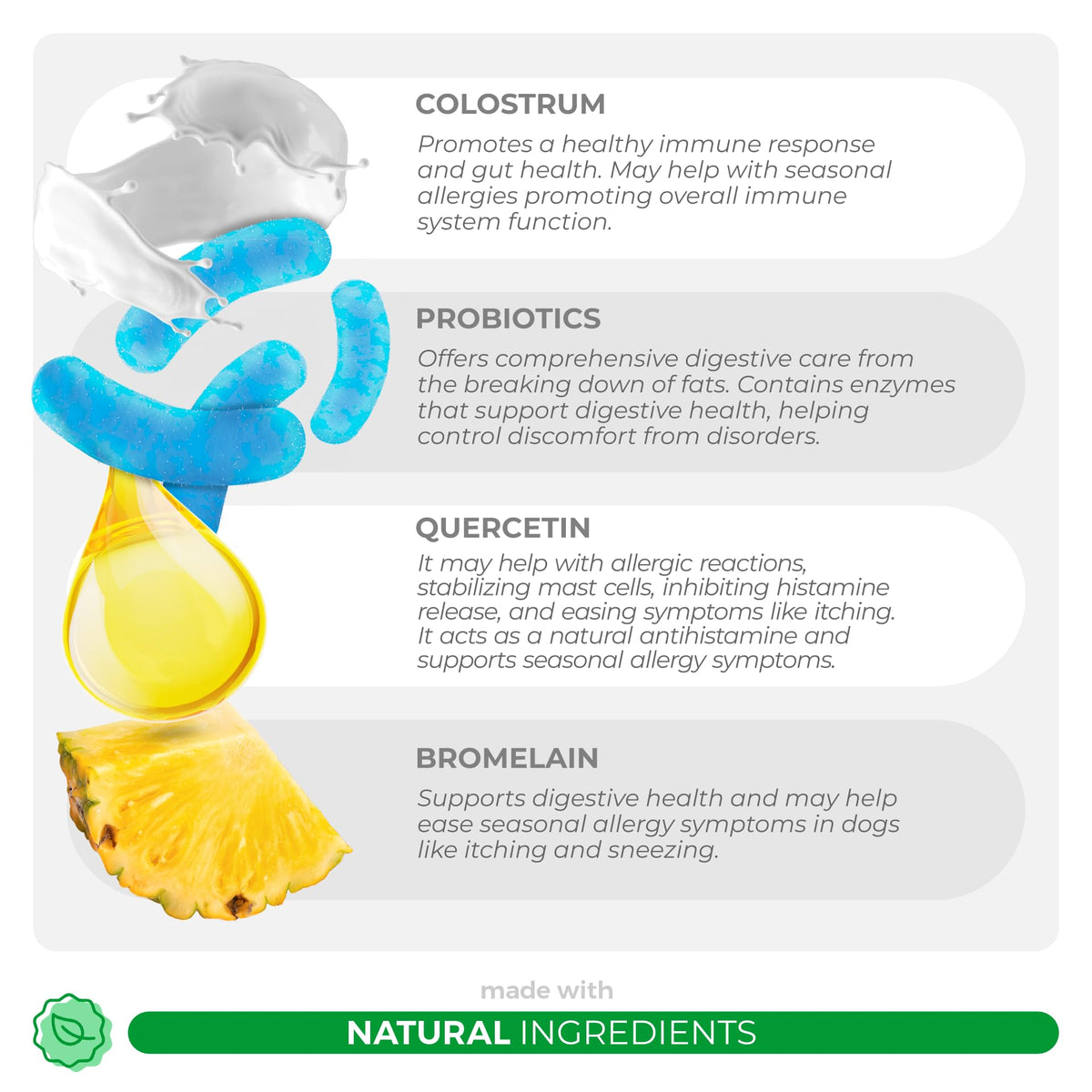 Allergy Relief for Dogs - Coco and Luna Allergy Support uses the best natural ingredients to address internal and external symptoms to relieve any allergies that may affect your dog. Immune Support - By combining powerful natural ingredients to boost the immune system and improve digestion, these allergy relief chews treat symptoms and help to address the underlying causes of allergies.
