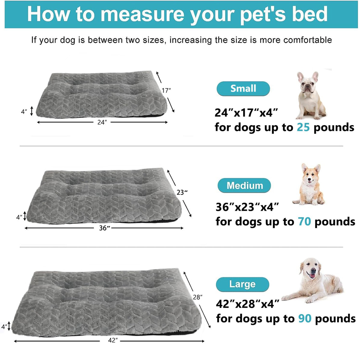 Crate Beds for Medium Large Dogs:After 18 months of research and research by our team day and night our team concluded that our crate bed size and 90% of the dog cages on the market can achieve perfect fit.This pad measures approximately 36'' L x 23''W x 4''Th.Fit for Medium Large dogs up to 80 lb.Such as:Beagle/Australian Shepherd/Chai Dog/Boxers/Doberman/bulldog/bully/German Shepherd/Husky/Cocker Spaniel/ beagle/West Highland Terrier/Boxer/Pitbull and so on.