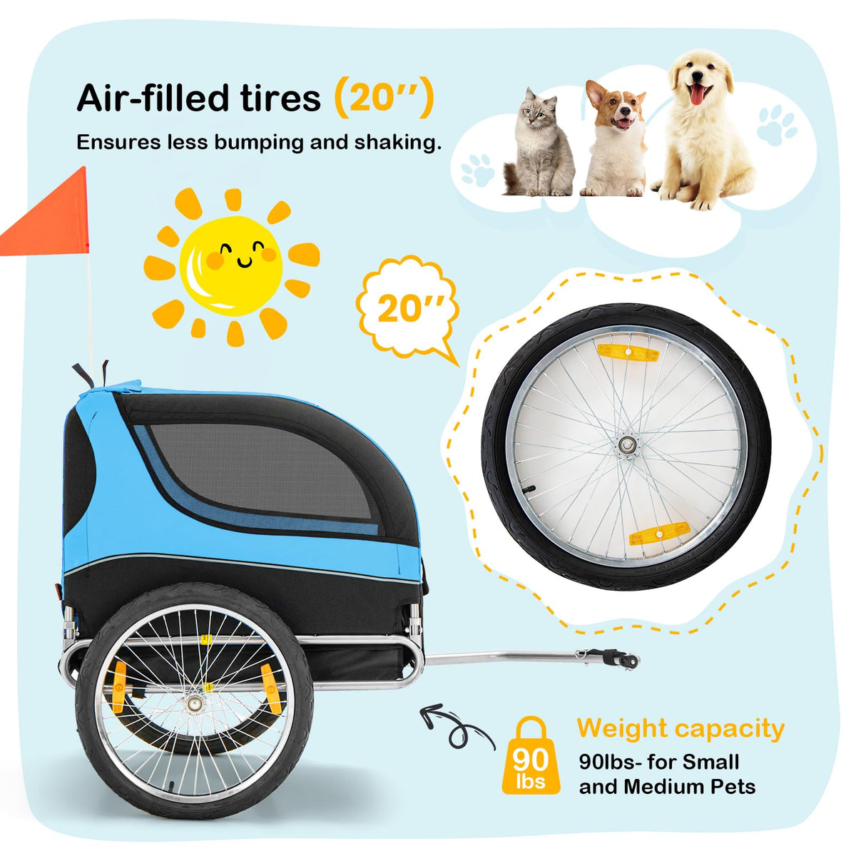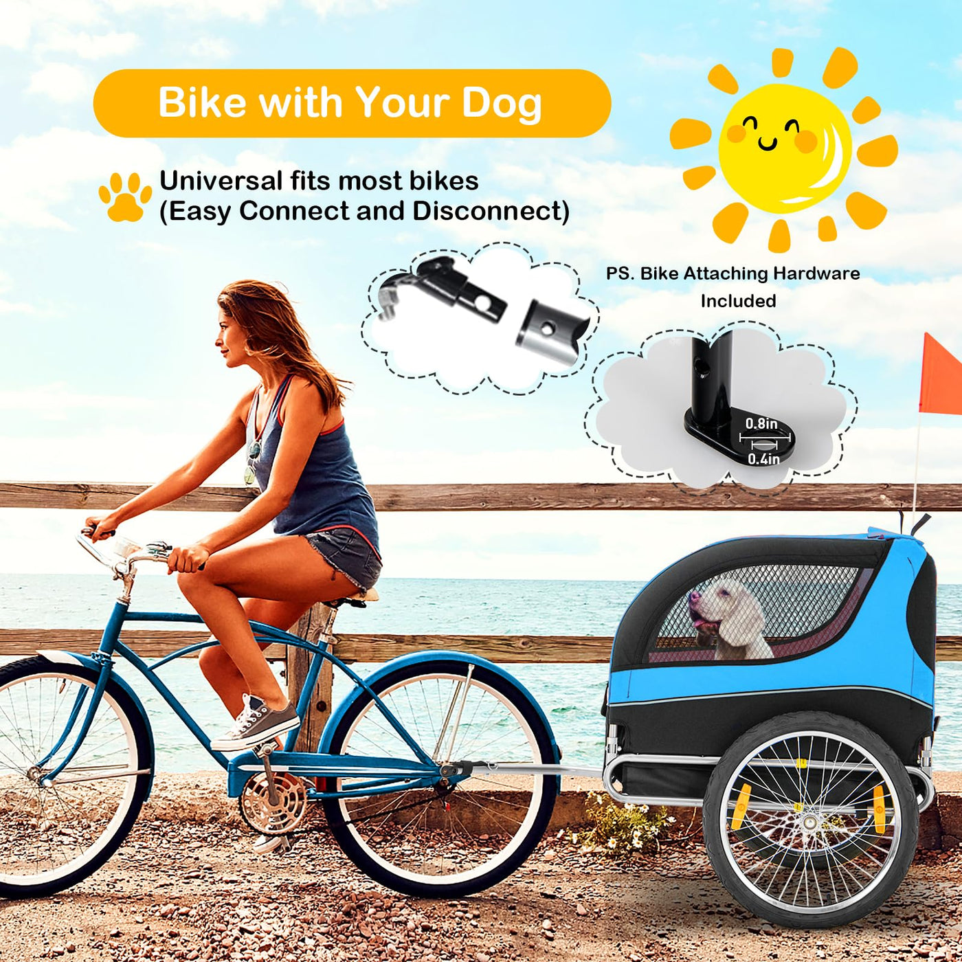 Q: How does the dog trailer attach to a bicycle?A: The dog trailer features a hitch with robust connectors and fasteners, allowing it to easily connect to most bicycles and quickly disconnect when not in use.