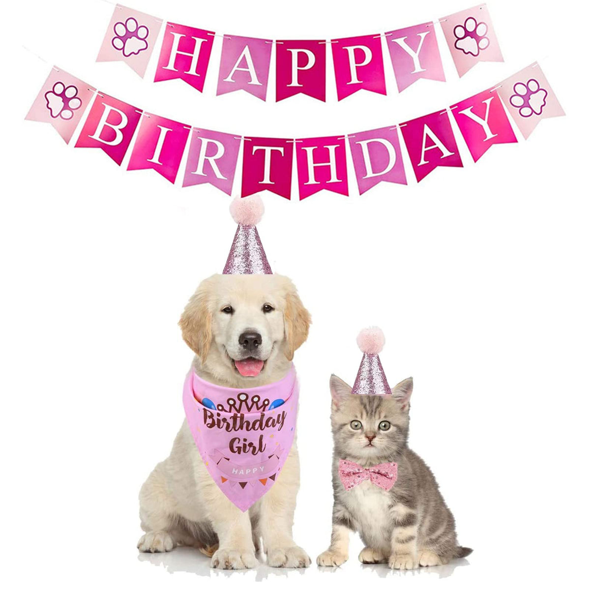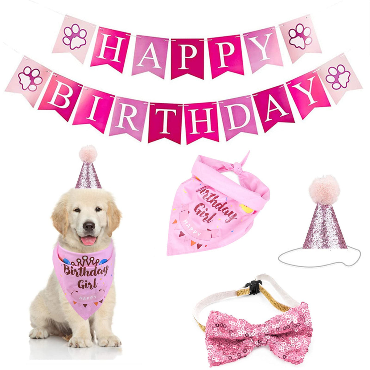 Dog Birthday Party Supplies-Dog Birthday Set With Dog Bandanas,Dog Hat,Dog Collar And Birthday Banner,Dog Party Decorations For Small Medium Large Dog Pet. (Pink)
