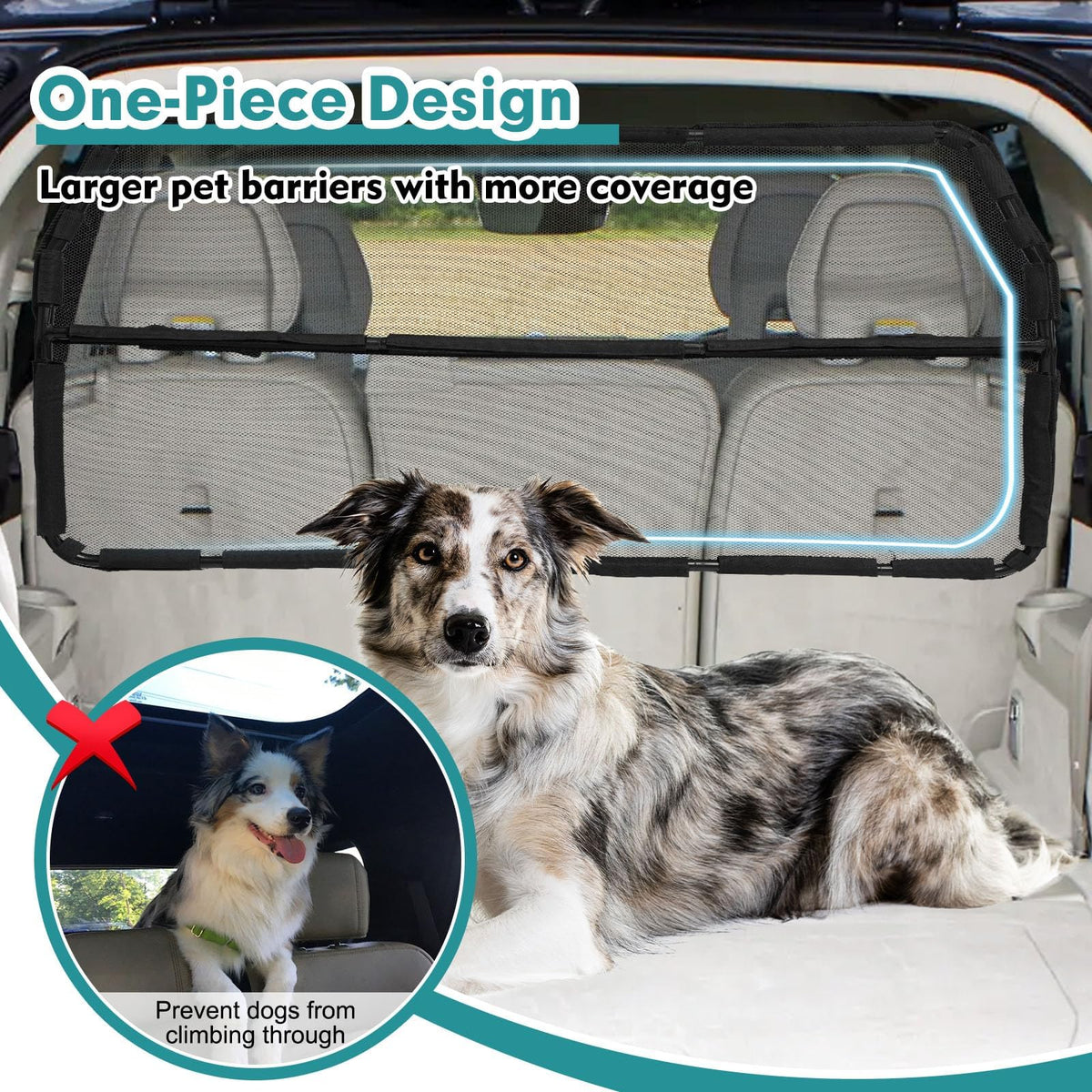 ?See-Through Net Barrier Ensure Security?Large range of net mesh design allows for more visibility than most pet barriers keeps your dog secure in the backseat or cargo area prevents your pets from jumping into the front seat which not only decreases driving distractions but also keeps your pet and all passengers safe during the trip.
