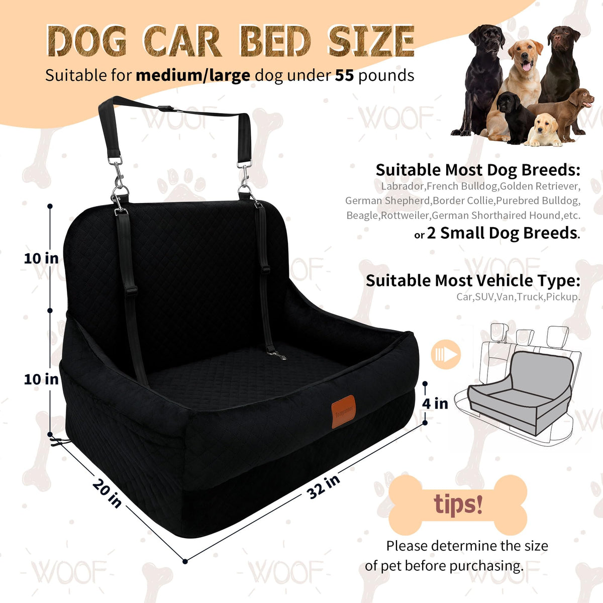 Tomyanner dog booster car seat for medium/large dogs The car dog bed measures 31.5 inches(L)x 20.5 inches(W)x 20.5 inches(H) with an interior height of 4 inches. It can accommodate large or medium dogs weighing up to 55 pounds or 2 small pets 25 lbs. The dog car seat for large dogs can be placed in the back seat or trunk of the car,it is suitable for almost all types of vehicles. Not only is it a booster seat,it can also be a dog sofa at home,a dog bed for outdoor camping,and so on. Pet travel car seat Surface made of soft short plush fabric,which can offer greater comfort and alleviate the pet anxiety during travel. In addition,it is filled with PP cotton and high density memory foam.With a non-slip design and 2 adjustable safety leashes that can be attached to your dogs harness,the booster travel dog bed is designed to ensure your dogs safety and comfort. The structure is strong and provides a sense of security,while the softness gives her a comfortable lying space to enhance your furry friends travel experience and give you more peace of mind when driving. Dog car bed The large car dog seat has a detachable design.When cleaning,open the zipper,take out the sponge and PP cotton,and put the dog seat cloth cover into the washing machine to clean. This dog bed for car back seat is very simple to install.Just follow the steps in the installation picture. Memory Foam booster Dog car seats are vacuum-sealed in packages.After unpacking,wait 24-48 hours for the dog car seat to decompress.