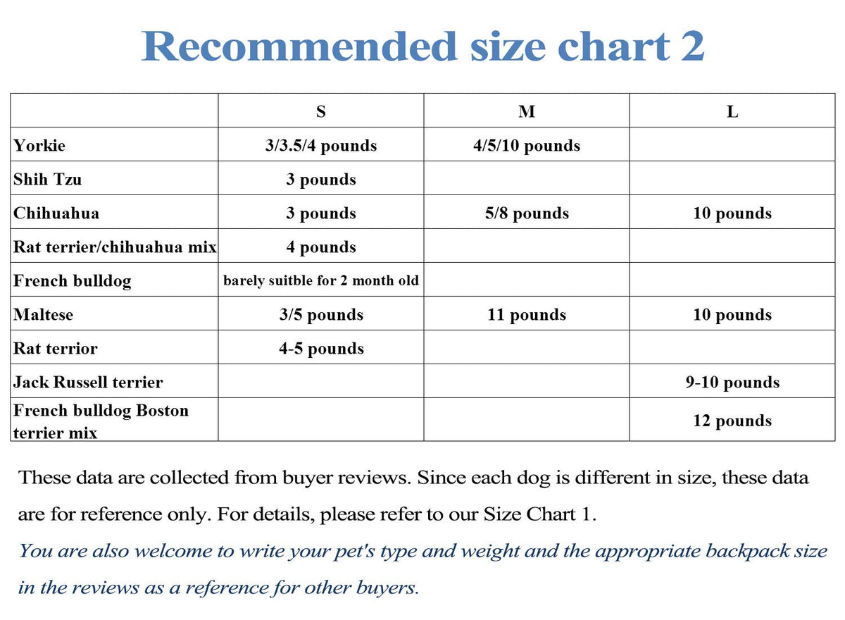 Notice: the Canvas carrier hasn't Elastic, so we suggest you to choose the bag's size bigger 3-4cm than the recommended Bust size. For example, if your pet's bust size is 28 cm, avoid to any unfit, we suggest you choice the M, not the S.