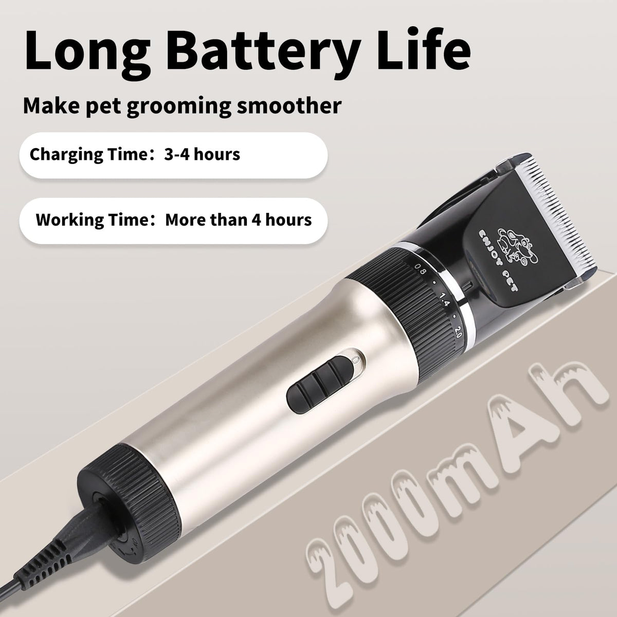 Q: How long does the battery last on the ENJOY PET Dog Clippers?A: The ENJOY PET Dog Clippers feature a powerful 2000mAh lithium battery that provides up to 4 hours of uninterrupted grooming after a quick 3-hour charge.
