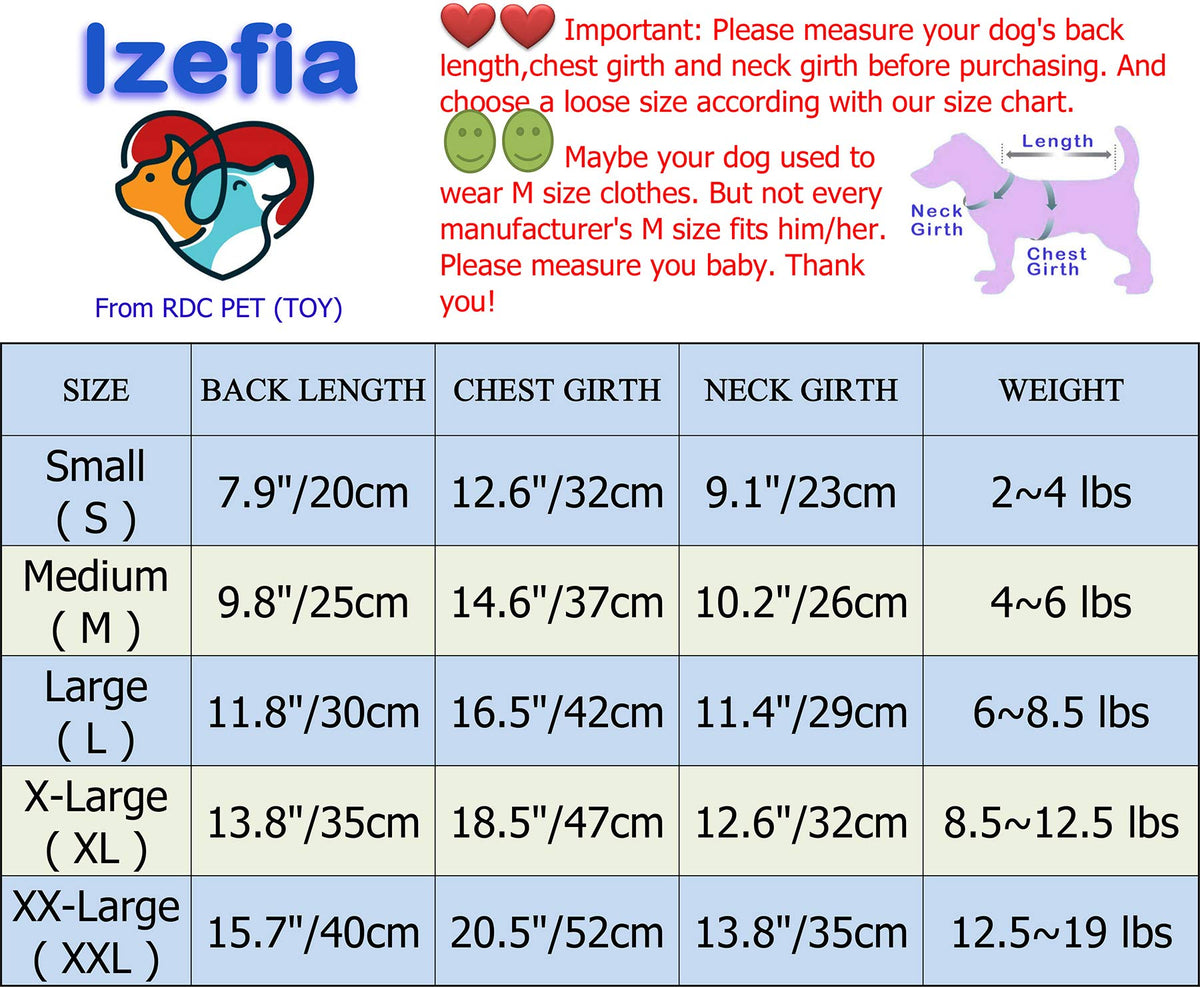 Izefia (Rdc Toy) - Your Pet's Ever ? Thick & Windproof & Soft! Made of pure cotton fabric. The thick cotton lining makes your dog have a warmer winter. ? easy-care, machine washable for this pet Coat. ? Classic and stylish British Aristocrat style makes your dog more gentleman and noble. In winter, just like a little prince on the snow. Oh no. Mustache, who reminds me of? You mean...Holmes. ? More Lovely, More Clever and Cute, more Pleasantly warm, Just for your pet. ? Various choice of sizes & color, Mainly for small dogs and medium dogs, not for large dogs. Please don't choose size according to a usual size, but to measure your pet's neck girth, chest girth and back length (especially the chest girth) and choose a size larger according to our size chart. Because the clothes are thicker, the inner space is smaller. Size Chart: S-- Back length: 7.9 inch ( 20 cm ), Chest girth: 12.6 inch ( 32 cm ), Neck girth: 9.1 inch ( 23 cm ) M-- Back length: 9.8 inch ( 25 cm ), Chest girth: 14.6 inch ( 37 cm ), Neck girth: 10.2 inch ( 26 cm ) L-- Back length: 11.8 inch ( 30 cm ), Chest girth: 16.5 inch ( 42 cm ), Neck girth: 11.4 inch ( 29 cm ) XL-- Back length: 13.8 inch ( 35 cm ), Chest girth: 18.5 inch ( 47 cm ), Neck girth: 12.6 inch ( 32 cm ) XXL-- Back length: 15.7 inch ( 40 cm ), Chest girth: 20.5 inch ( 52 cm ), Neck girth: 13.8 inch ( 35 cm )