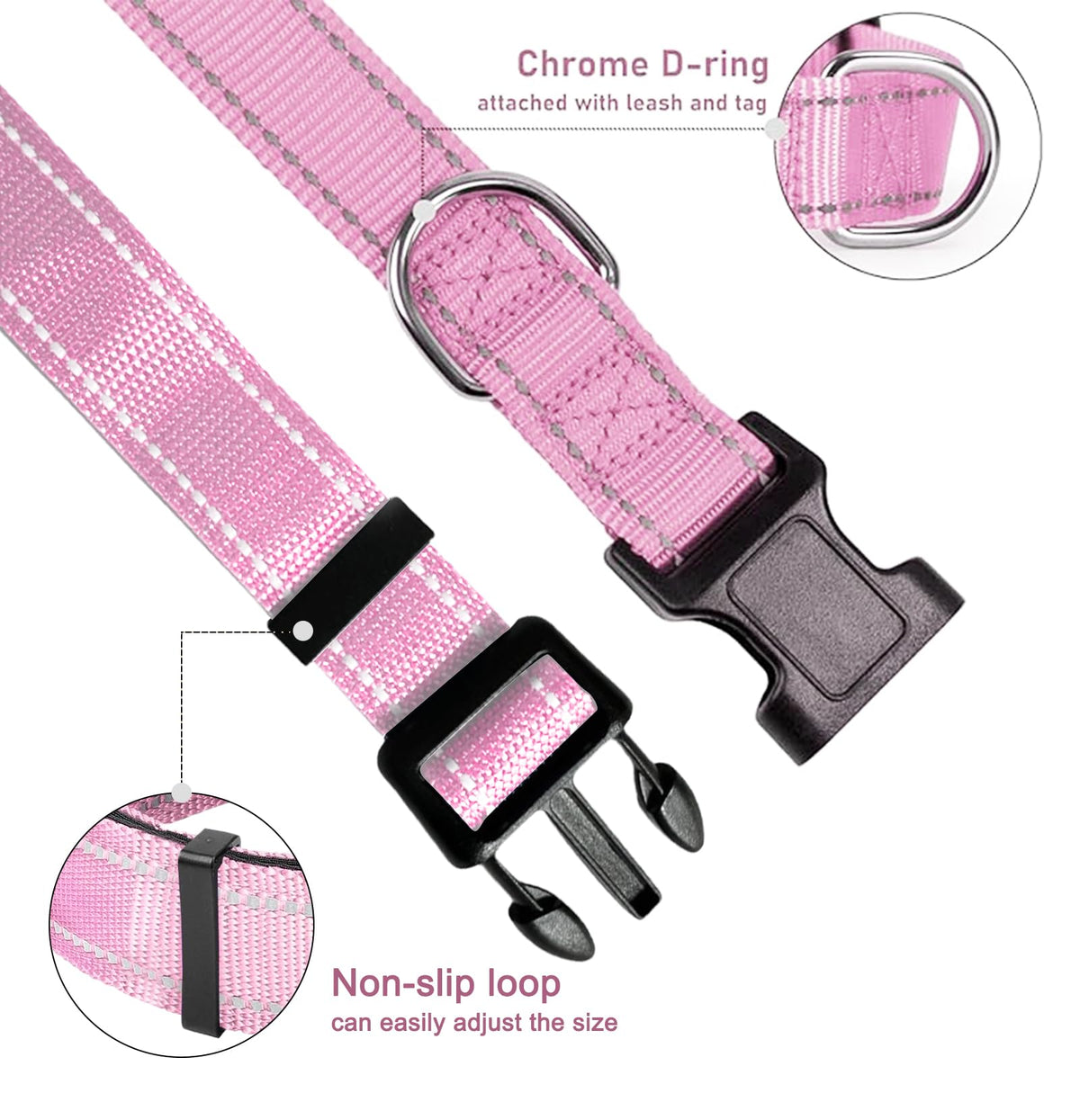 Dog Collar, Reflective Pet Collar with Buckle Adjustable Safety Nylon Collars for Small Medium Large Dogs, Pink, XXS
