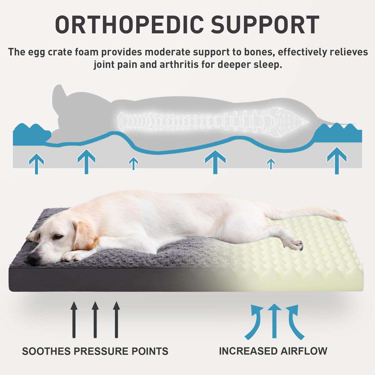 Q: Does this dog bed provide orthopedic support?A: Absolutely! The Dog Crate Bed is equipped with a 3-inch thick high-density egg crate foam that provides excellent support for bones and joints, making it ideal for puppies and older dogs.