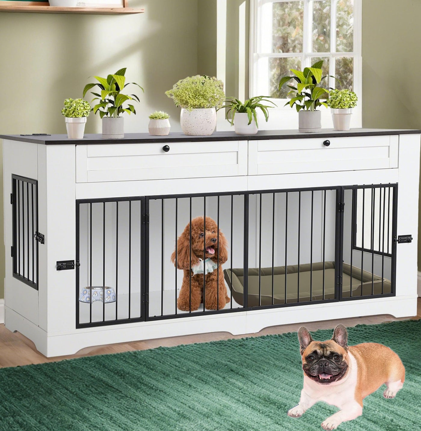 Our dog crate furniture, also known as dog kennel furniture or dog crate tv stand, is a multi-functional and stylish piece. It serves as a TV stand and has a pet toy drawer, combining pet comfort and home aesthetics. Suitable for various sizes including large dog crate and large breed dogs, it provides a safe enclosure. Made of thickened high-quality steel and chew-resistant medium-density fiberboard with bitter agents on the boards to prevent chewing and licking. It s tech-savvy with a vertical charging hub (3 AC, 1 USB, 1 Type C ports). Easy to install with clear instructions and recommended for assembly by two or more people for larger parts. Ensure your pet s comfort by measuring its height and length before choosing the appropriate sized dog crate.