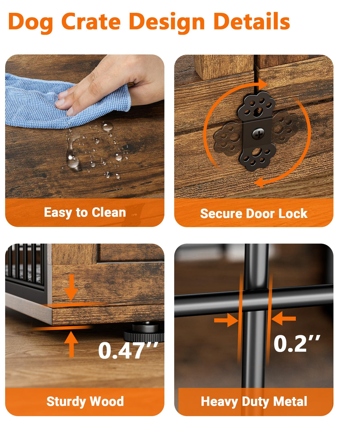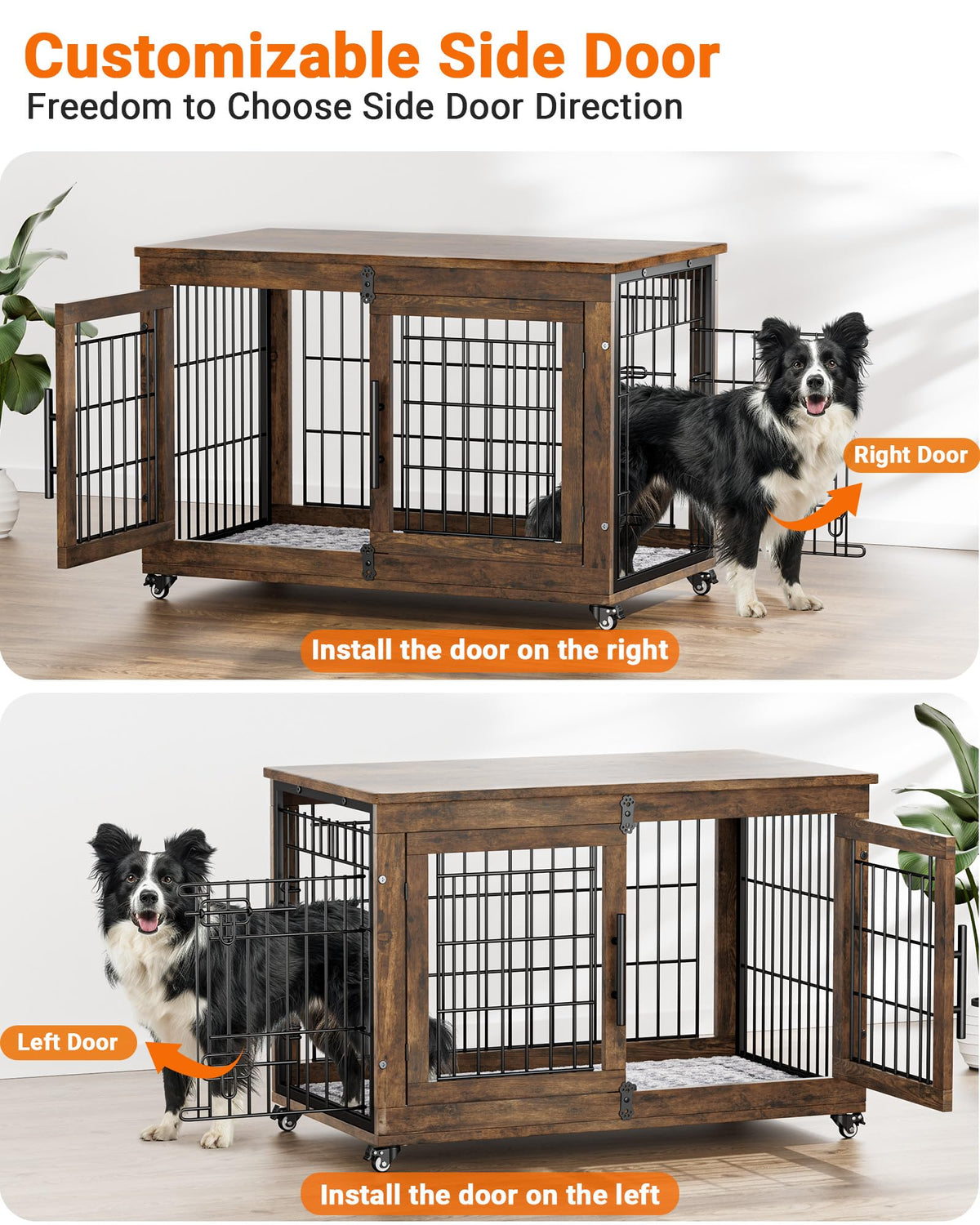 YaFiti Dog Crate - a multifunctional and sturdy chew-resistant dog crate that provides a comfortable and secure space for your pet. Whether you need a crate, a cozy den, or a stylish piece of furniture, this dog kennel has you covered.Why Choose YaFiti Furniture-Style Large Dog Crate?Made from high-quality materials, this dog crate furniture is sturdy and chew-resistant. The wooden board structure at the bottom protects your dog s feet from harm. You can rest assured that your pet will stay safe and secure inside the dog kennel indoor.Featuring double doors, this dog house provides easy access for your dog. You can choose the side door to the left or right.For added convenience, this dog crate comes with 360 lockable wheels or anti-slip feet. The 360 lockable wheels make moving the dog kennel furniture around your home easy, allowing you to find the perfect spot for your pet.The upgraded door lock ensures that your pet stays safely inside the kennel, while the cushion provides extra comfort during their stay.The included cushion provides a comfortable and cozy spot for your pet to relax and rest. The cushion is removable and machine washable, ensuring easy maintenance.Dog Crates for Large Dogs Size:Overall Size: 38.5 L x 25.2 W x 26.8 HInner Size: 35.5 L x 21.7 W x 23.6 HPackage Contents:2 x Furniture-style Dog Crate2 x InstructionsNote:Make sure to measure your pet before selecting the dog crate furniture for a large dog size. The interior dimensions of the crate should be 1-2 inches taller and 4-5 inches longer than your pet.