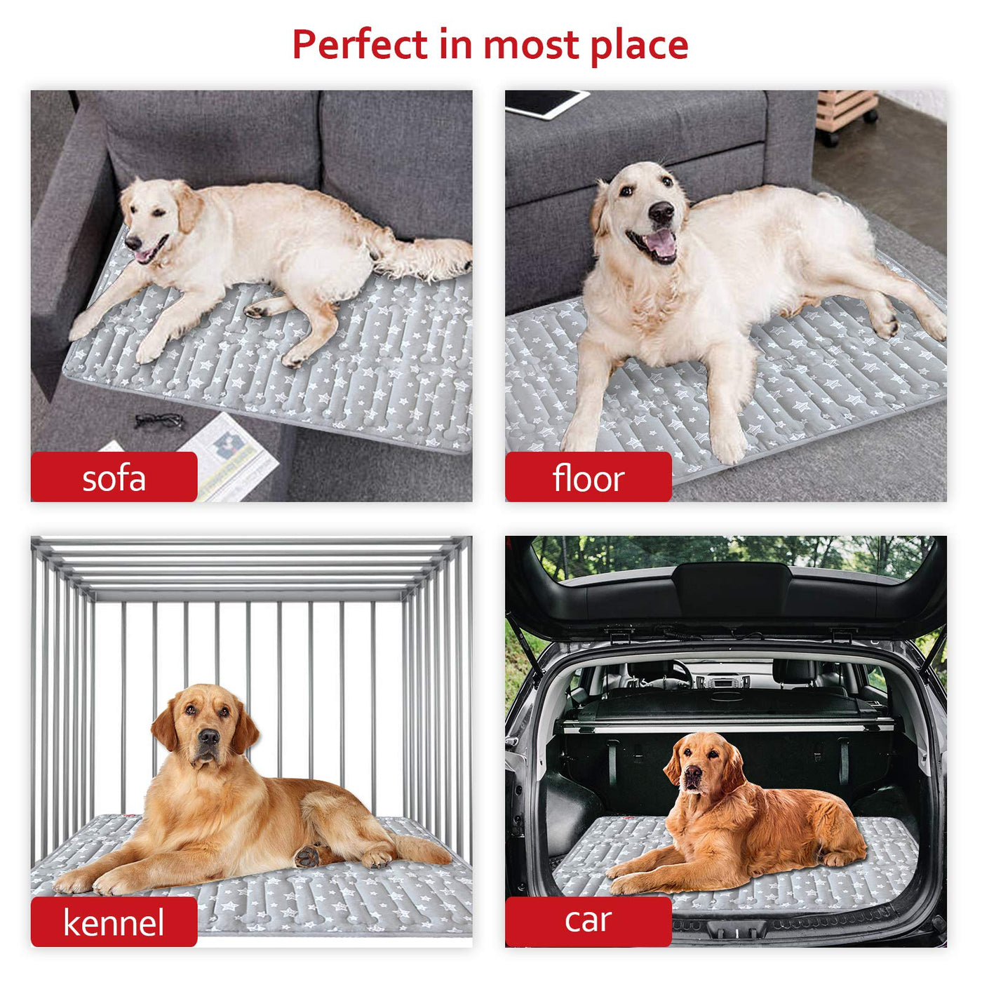 Q: What are the dimensions of the Dog Crate Mat?A: The Dog Crate Mat measures 42 inches by 28 inches, making it suitable for large dog crates and providing ample space for your pet to rest comfortably.