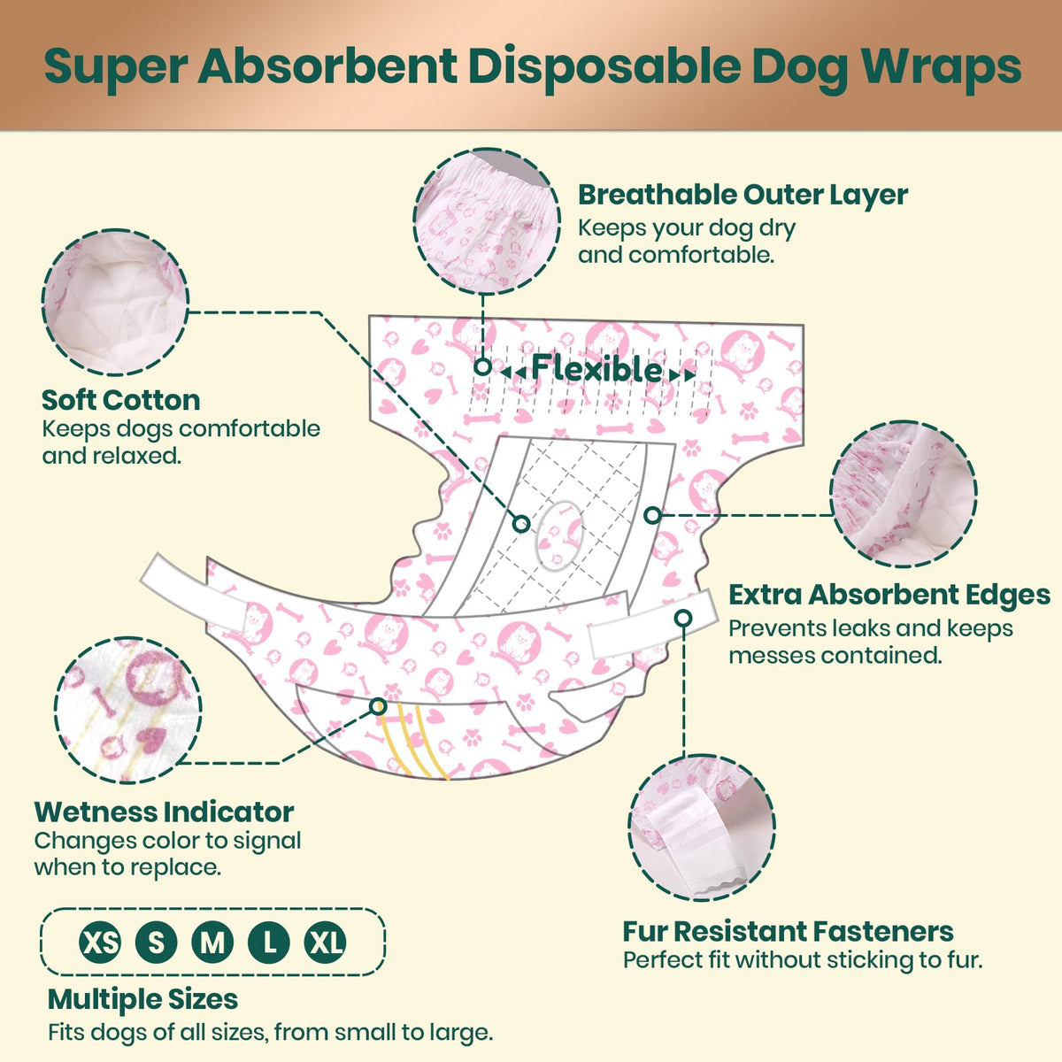 Ensure your dog stays dry, comfortable, and protected with our premium Leakproof & Super Absorbent Dog Diapers. Designed to provide reliable protection for dogs of all sizes, these diapers feature a highly absorbent core that instantly transforms urine into gel, preventing leaks and odors. Whether youre managing incontinence, training, or traveling, our dog diapers offer a safe and convenient solution for your pets needs. Product Features: Leakproof & super absorbent core Adjustable, fur-safe fasteners for a secure fit Breathable materials for added comfort Versatile use for training, incontinence, travel, and senior dogs Wetness indicator for easy monitoring of usage Sizing Information: Our dog diapers are available in multiple sizes to ensure a perfect fit for dogs of all breeds and sizes. Please refer to the sizing chart for accurate measurements.