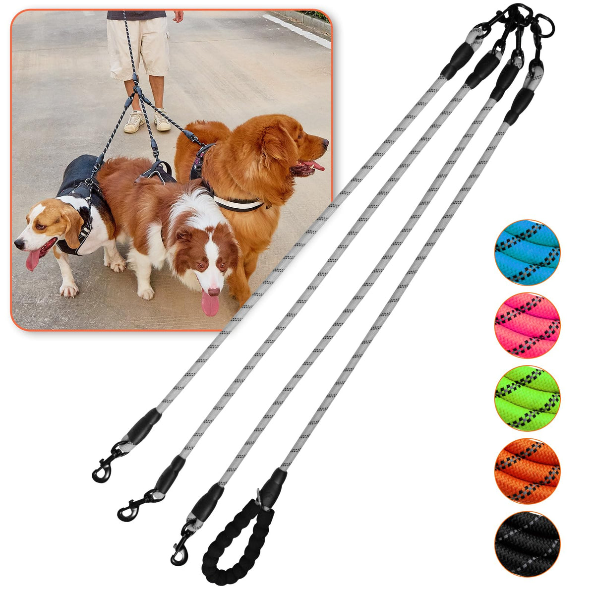 Introducing Our Innovative 3 Dog Leash, A Must-Have Tool For All Dog Owners With Multiple Four-Legged Friends. This Leash Allows You To Effortlessly Walk Up To Four Dogs At Once, Providing Convenience, Control, And Peace Of Mind. Say Goodbye To Tangled Leashes And Hello To A Stress-Free Walking Experience! Our 3 Dog Leash Is Specifically Designed To Eliminate Tangles And Knots, Ensuring A Smooth And Enjoyable Walk For Both You And Your Dogs. No More Struggling To Untangle Leashes As Your Dogs Excitedly Run In Different Directions. With Our Leash, You Can Confidently Navigate Through Your Neighborhood Or Park, Knowing That Your Pups Are Secure And Tangle-Free. Crafted From High-Quality Materials, This Leash Is Durable, Lightweight, And Built To Withstand Even The Most Energetic Dogs. The Leash Offers Four Individual Extensions, Allowing Each Dog To Have Their Own Comfortable Space While Still Remaining Connected To You. Whether You Have Small Or Larger Dogs, Our Leash Accommodates Them All, Providing Flexibility And Versatility. With Its 3-In-1 Functionality, This Leash Offers Various Configurations To Suit Your Specific Needs. Use It As A Three-Way Leash, Allowing Each Dog To Have Their Own Separate Lead. Alternatively, You Can Pair The Dogs Up Or Leash Them All Together For More Control. The Choice Is Yours! Our Leash Is Also Ideal For Training Purposes, As It Gives You The Ability To Guide And Correct The Behavior Of Each Dog Individually. Safety Is Our Top Priority, Which Is Why Our Leash Features Sturdy And Secure Clasps To Ensure That Your Dogs Remain Securely Attached. The Comfortable And Adjustable Handle Provides A Firm Grip, Reducing Strain On Your Hands And Wrists During Long Walks. Additionally, The Leash Is Reflective, Enhancing Visibility During Low-Light Conditions For Added Safety. Designed For Both Small And Large Dogs, Our 3 Dog Leash Is Suitable For Any Breed Or Size. Whether You Have Multiple Small Dogs Or A Combination Of Sizes