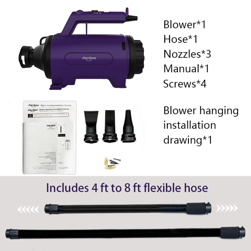 ?-Perfect industrial design workmanship is more elegant. ?-Good choice for family user drying large or long haired dogs.Also suitable for grooming shops or other business use. ?-Air Volume: 100 CFM/Air Speed: 44000 FPM/Volts: 110V ?-2 temperature settings Low High Temperature: 55F to 118F ?-Powerful motor up to 3.2 Peak H.P./13 amps/Voltage 110V/60/Noise value:38dB-72dB