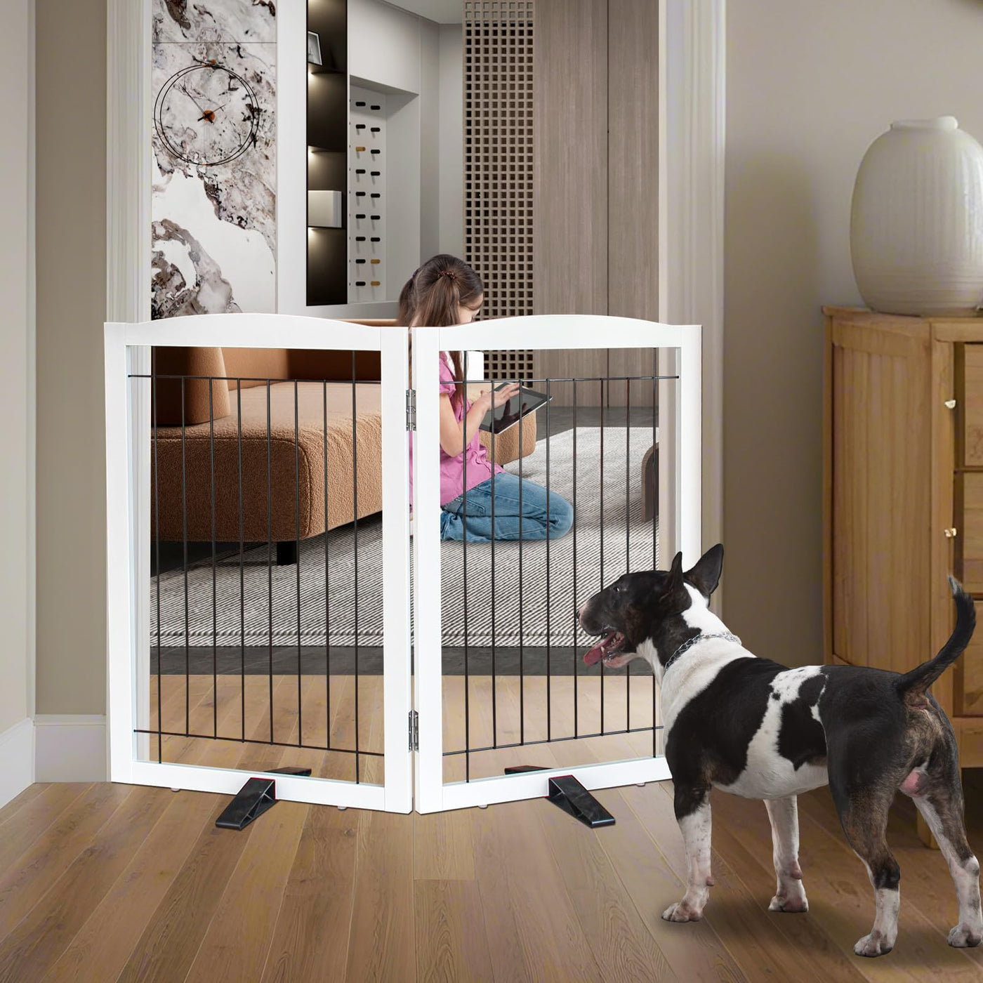 This is a very useful dog gate, it can limit the family pet in a certain place, do not let it run, foldable dog gate can be well blocked in the doorway, corridor and stairs, you can put different shapes according to your needs, pet gate indoor does not need to be installed, easy to expand can be used, folding, convenient storage, you can put it anywhere in the home, Saving space, dog gate for house is fitted with rubber pads at the bottom, so you don't have to worry about scratching the floor. Simple and stylish design with a white exterior that perfectly matches your home decor. FEATURES: 1?Constructed from wood and strong wire 2?Expanded to accommodate almost any width 3?Arrives fully assembled 4?Folding, free-standing design 5?Suitable for dogs of all sizes and breeds 6?Fold down quickly for easy storage. 7?Sturdy, non-slip rubber feet that keep your floors safe from scratches 8?Stylish and elegant look great with any array of decorating styles