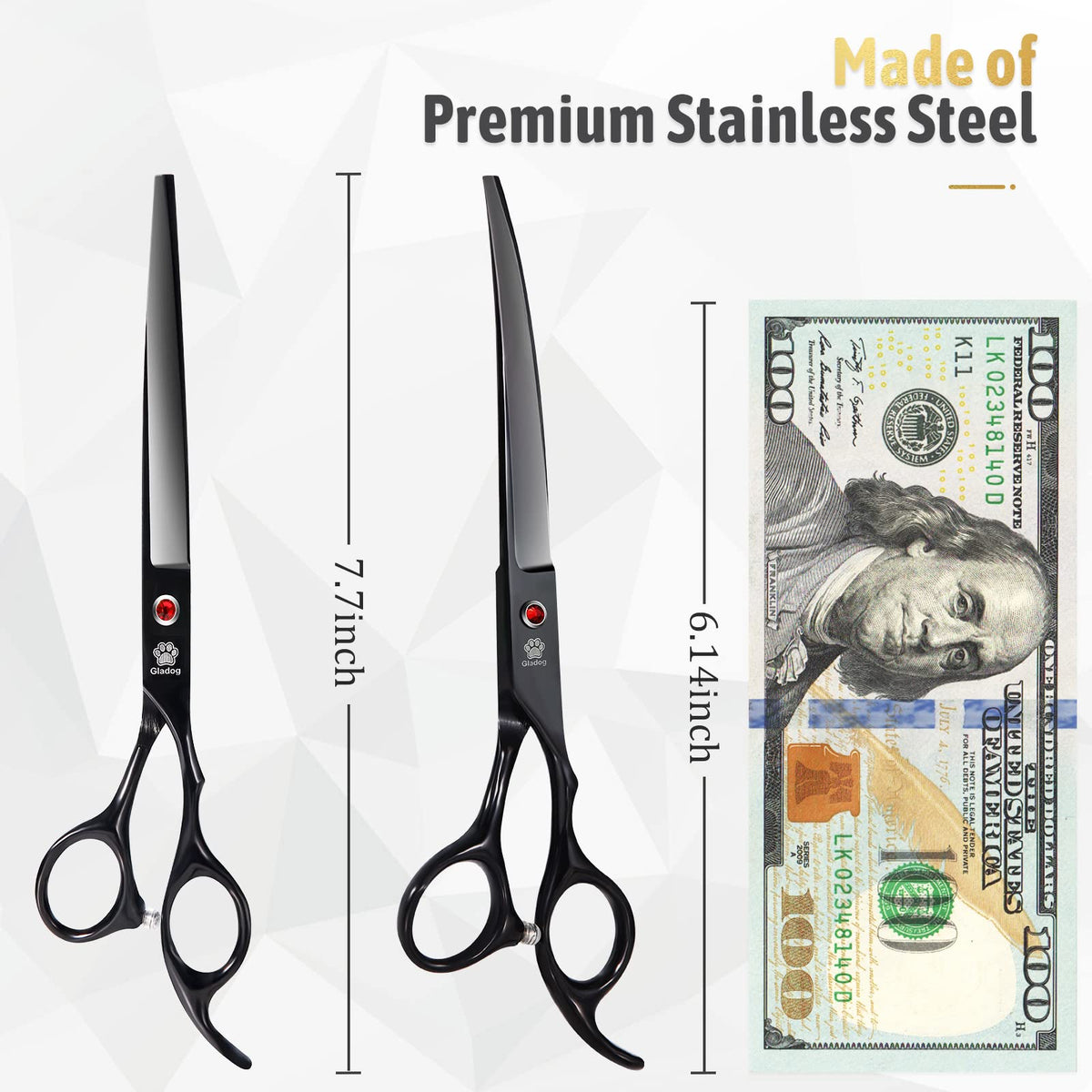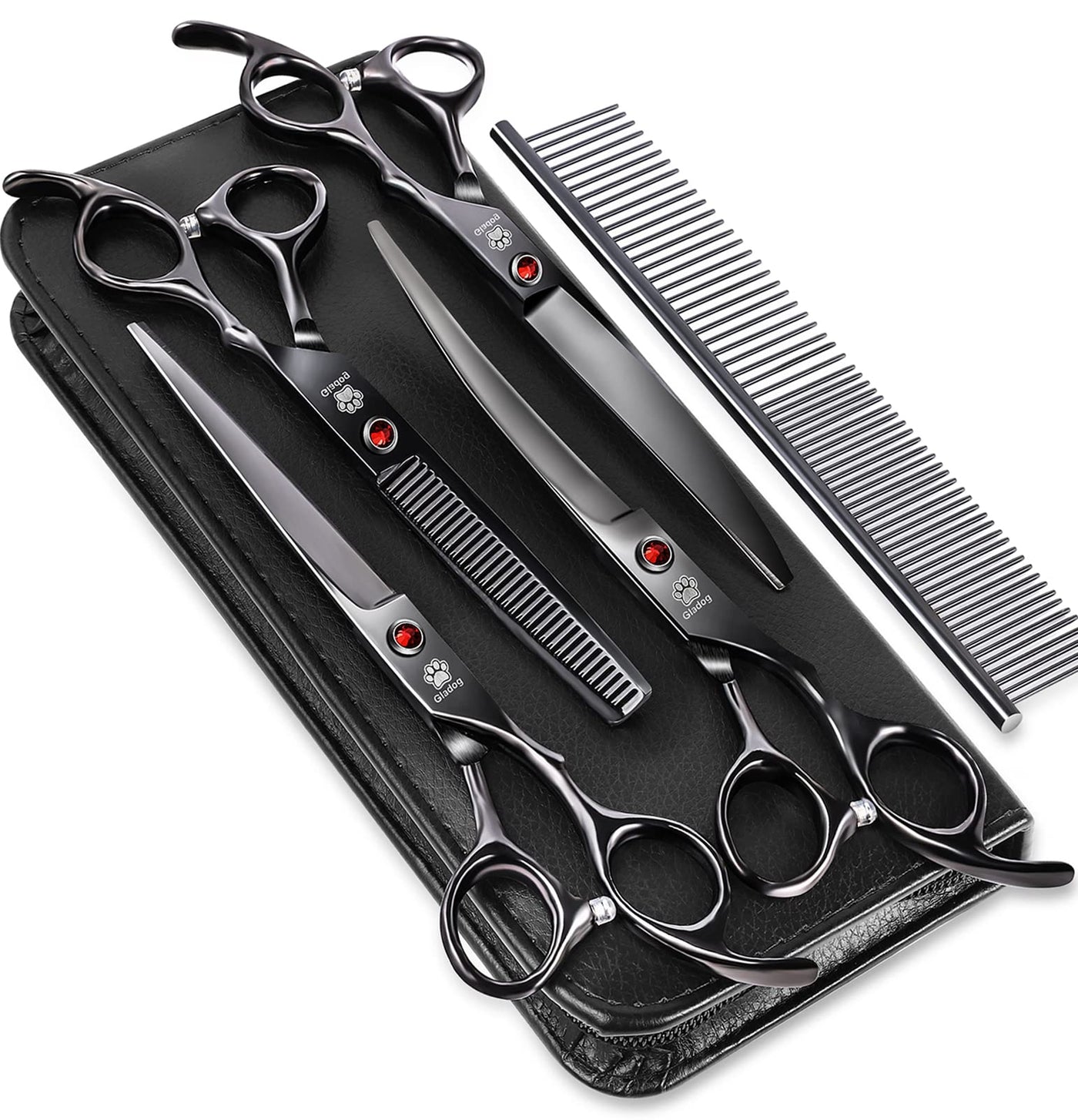 ??Package List V Straight Scissors 6.5'' 1 V Curved Scissors 6.5'' 1 V Thinning Scissors 6.5'' 1 V Pet Comb 1 V Cleaning Cloth 1 V Black Leather Case 1 ??Straight Scissors ?Mainly Used For Cutting Pet Hair Flat Parts Such As Body And Legs. ??Thinning Scissor ?Mainly Used To Thinning Hair, Making The Hair More Natural And Beautiful After Pruning. ??Curved Scissor ?Mainly Used For Trimming Your Pet'S Face, Belly, Hip, Paws, And Other Sensitive Area. It'S An Essential Tool For Beauty Modeling. ??Grooming Comb ?Wide Teeth Are Used To Remove Tangles Safely And Painlessly, While Close Teeth Are Used To Remove Loose Hair And Any Debris That May Remain. ?No Risk: 90-Day Money Back Guaranteed. If You Have Any Problem, Please Contact Us Through Buyer Seller Message , So We Can Make It Right For You.