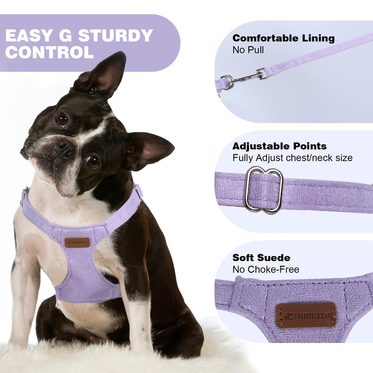 Q: What materials are used in the construction of the harness?A: The harness is crafted from soft, breathable suede fabric that is gentle on your dog's skin. It features durable hardware that is resistant to deformation, fading, and is waterproof and rust-proof.