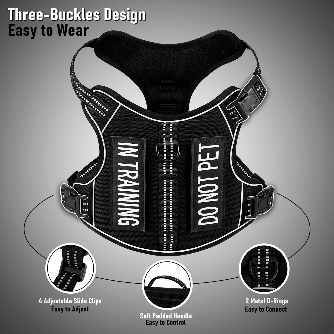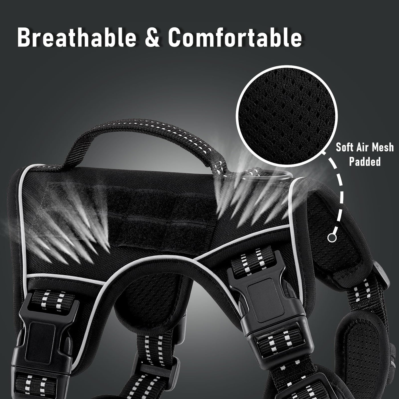Breathable And Comfortable- Our Harness Is Made Of Durable Nylon Oxford And Padded With Soft Cushion To Protect Your Dog'S Skin. Breathable Air Mesh Keeps Your Dog Cool During Outdoor Activities. Super Reflective- The Reflector Points Are Very Bright. Having It In Our Harness That Reflects Light Gives Your Dogs A Lot Of Safety That Eases Your Anxiety When You Are Chasing Them Barefoot Down The Road In The Dark, You Can Spot Them Right Away. It Is Really Safe For Nighttime Walking. 4-Way Fully Adjustable- Our Adjustable Harness Has 4 Easy Adjusting Straps. You Can Use Its 2 Neck Straps And 2 Chest Straps To Create A Perfect Fit For Your Dog. It Is Easy To Adjust To A Larger Size As He/She Grows. No Worries About Slipping Out Or Choking. There'S A Snap Buckle Closure At The Side Of The Neck, And Then One On Each Side Of The Torso Part. So, All Your Dog Has To Do Is Stand There, Let You Unclick The 3 Closures And It Falls Right Off Of Her/Him. 3 Buckles Make It So Easy To Put This Harness On Your Dog And Take It Off, All Done By Yourself, Without Another Person'S Help. Also, You No Longer Have To Try To Slide A Harness Over Your Dogs Head. Both D-Rings ( Front & Back ) Are All Metal, Very Strong. The Front D-Ring Allows You To Have Full Control Over Dogs And Give Them Better Comfort. The Back D-Ring Is Ideal For Daily Dog Walks, Jogging, Or Hiking. Theres A Handle To Help Control When Your Dog Gets Excited For Going On Walks. It Will Allow You To Grab Dogs Quickly And Get Better Control Over Them Than A Leash Or Grabbing Their Collars Would Do. It Also Can Be Used In The Car With A Seat Belt Attachment And Dogs Are Secure In Case Of An Accident Or Stopping Short.