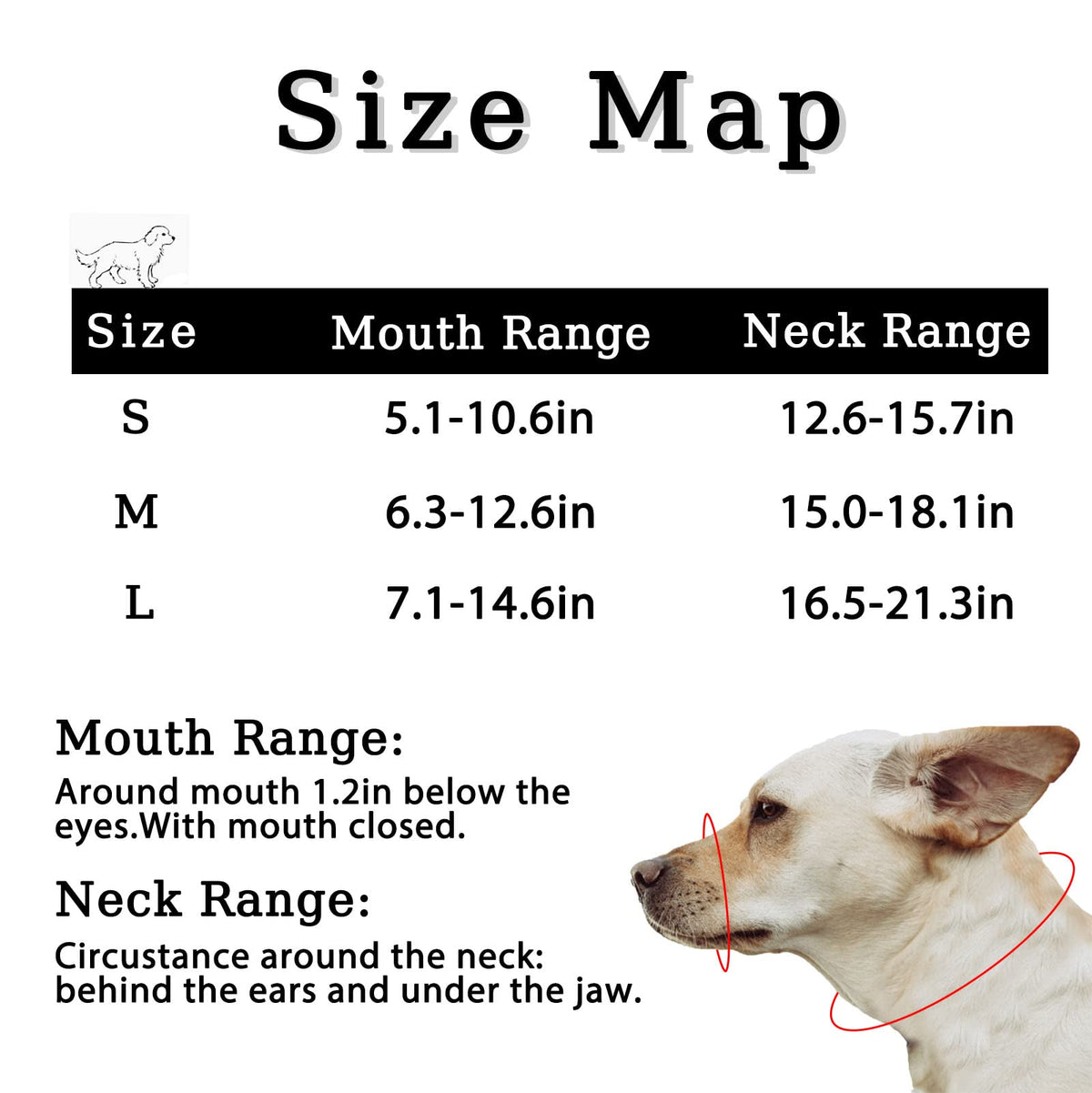 Q: What sizes are available for the Dog Head Collar?A: The Dog Head Collar is available in four sizes: S (Snout Circumference: 5.11-10.62 inches; Neck Strap: 12.59-15.74 inches), M (Snout Circumference: 6.29-12.59 inches; Neck Strap: 14.96-18.11 inches), L (Snout Circumference: 7.08-14.56 inches; Neck Strap: 16.53-21.25 inches), and XL (Snout Circumference: 8.66-16.53 inches; Neck Strap: 18.5-25.98 inches). Please refer to the size map to select the most suitable size for your dog.