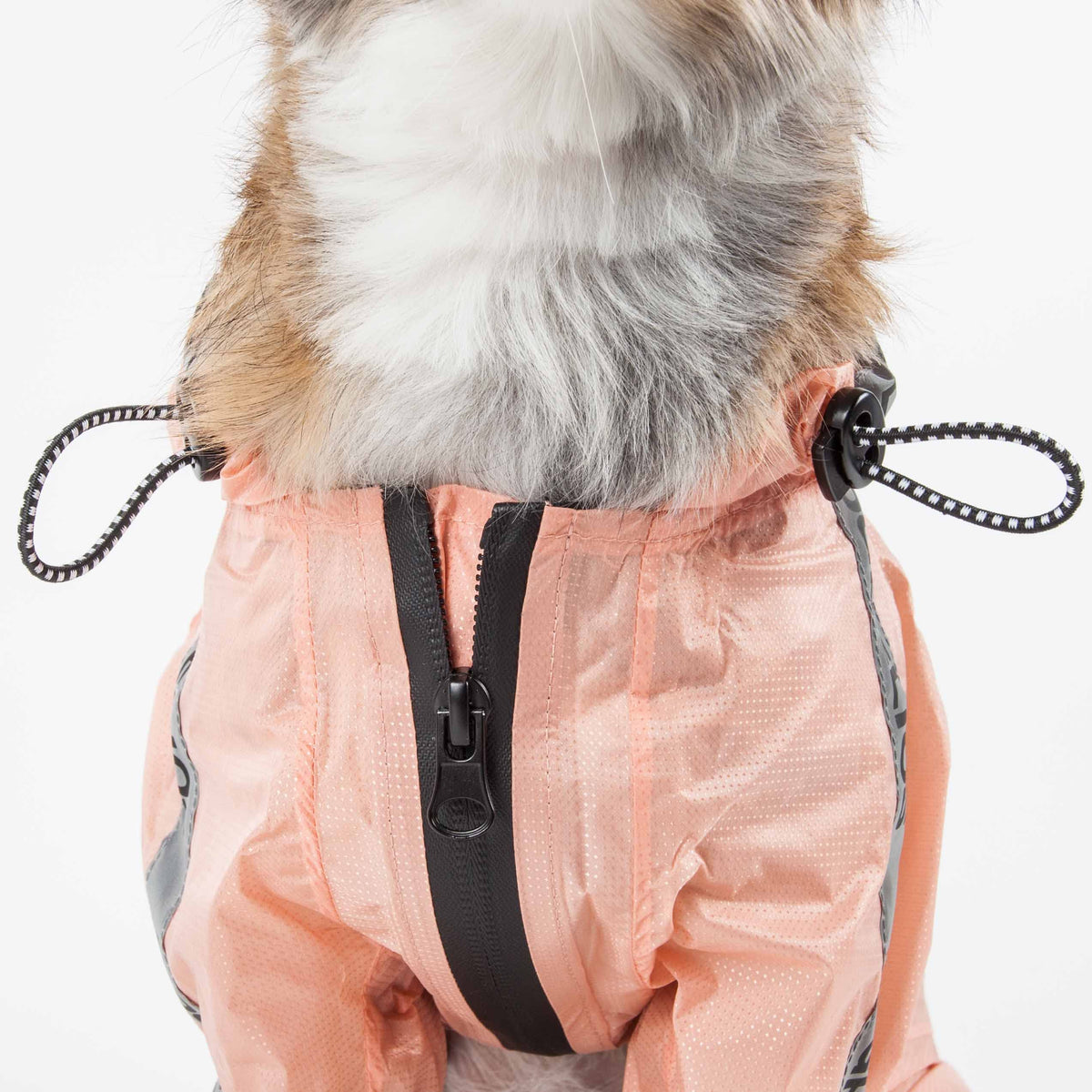 Q: How do I ensure a proper fit for my dog with this raincoat?A: To ensure a perfect fit, refer to the sizing specifications provided. The raincoat features adjustable stoppage jaw strings at the hood and waist, as well as elastic banding around the body and sleeves for a customizable fit.