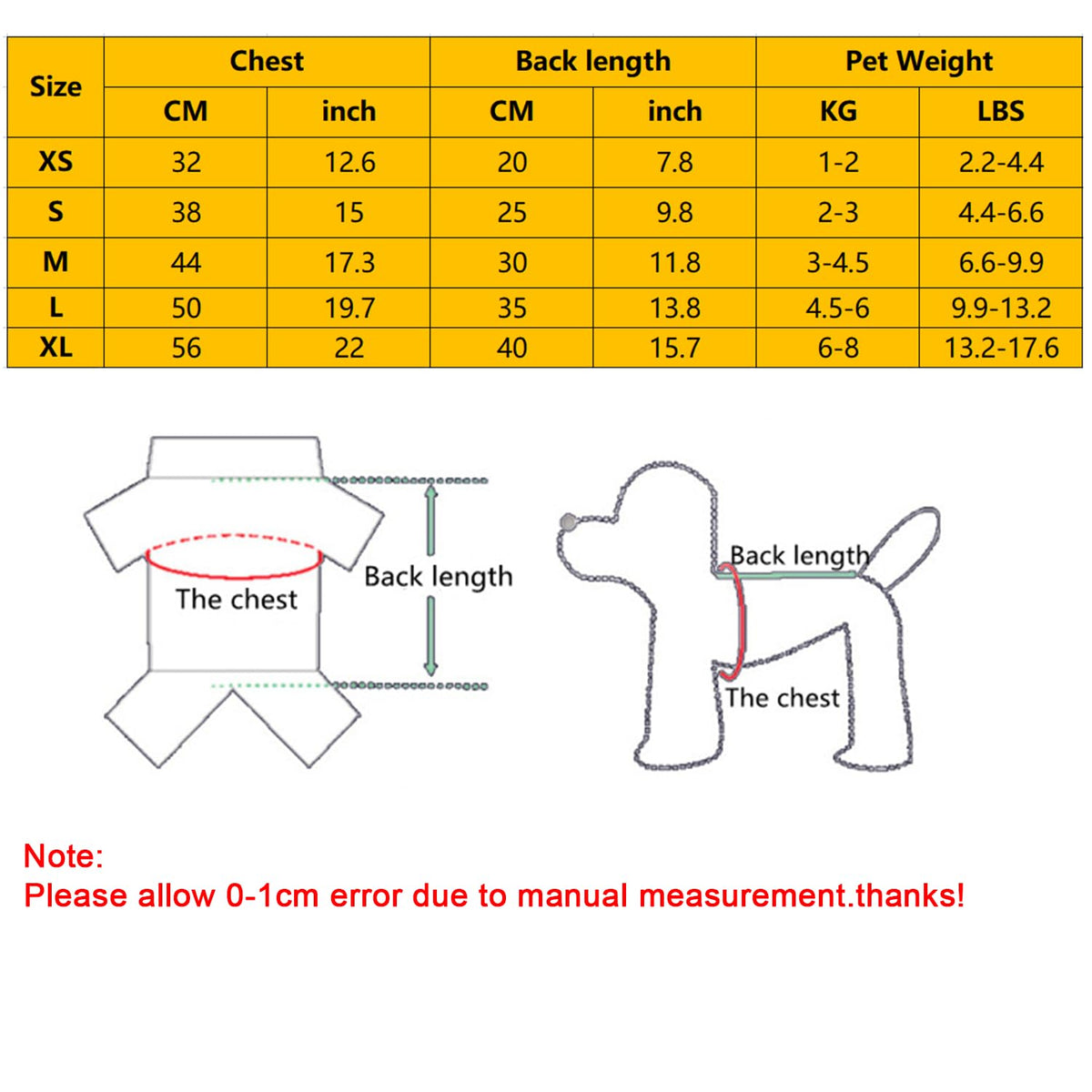 1. Size: S - Chest 38cm/15in Back Length 25cm/9.8. Fit for 2kg-3kg/4.4-6.6lbs weights dog.
