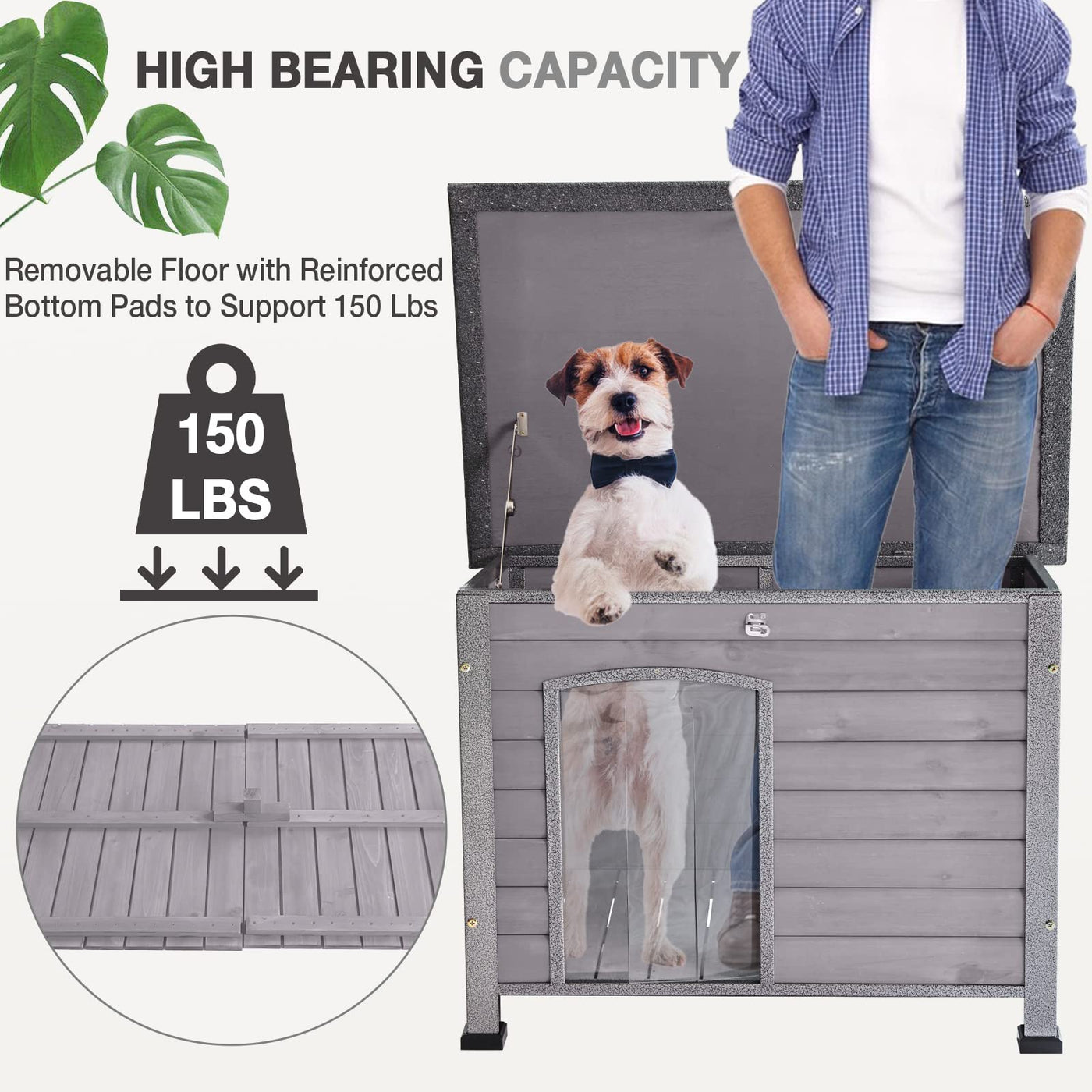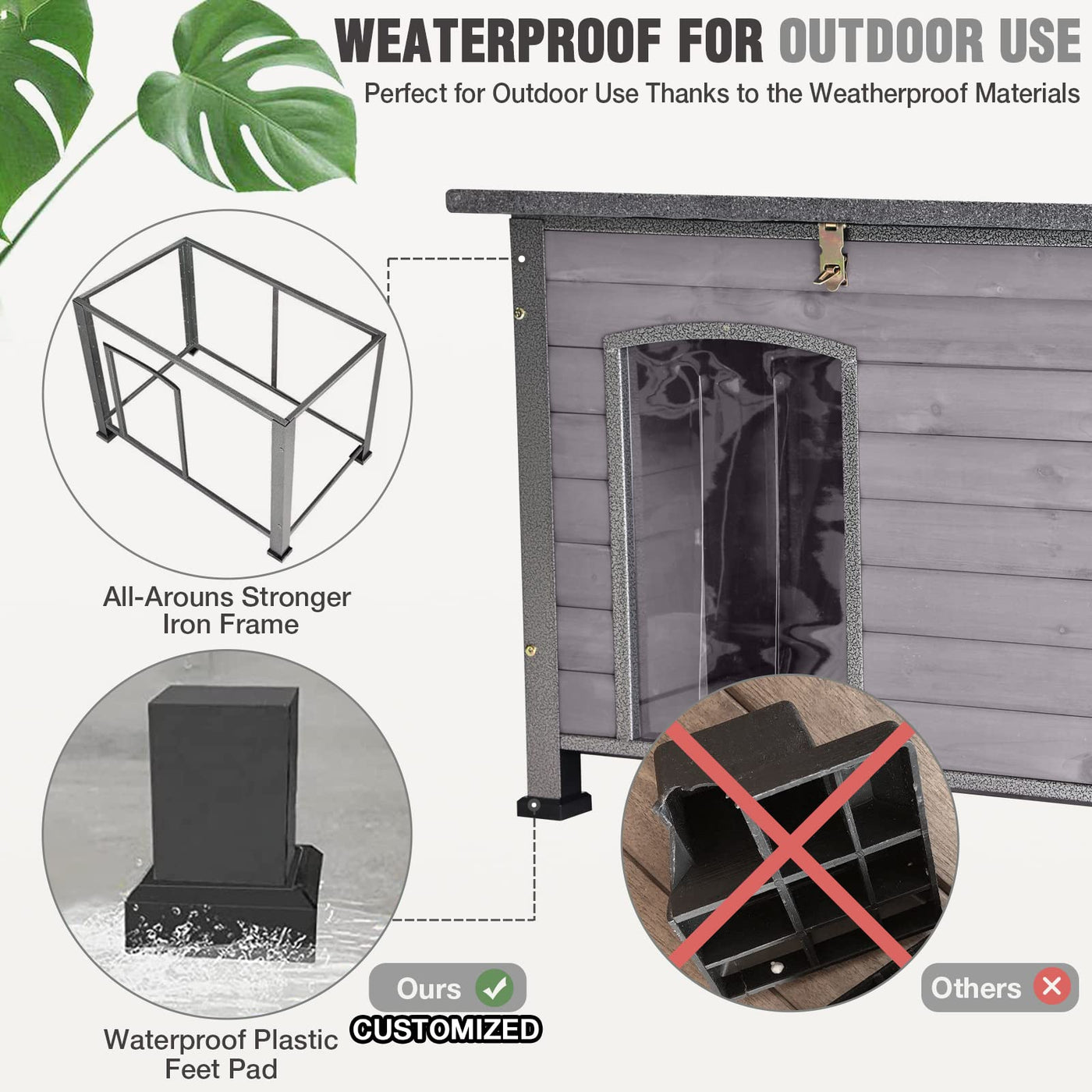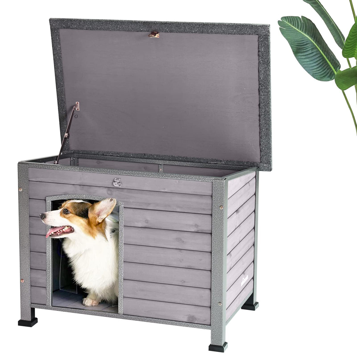 Dog House Outdoor Insulated Dog House For Small Medium Dogs, Natural Wood With Iron Frame, Waterproof Roof Raised Feet
