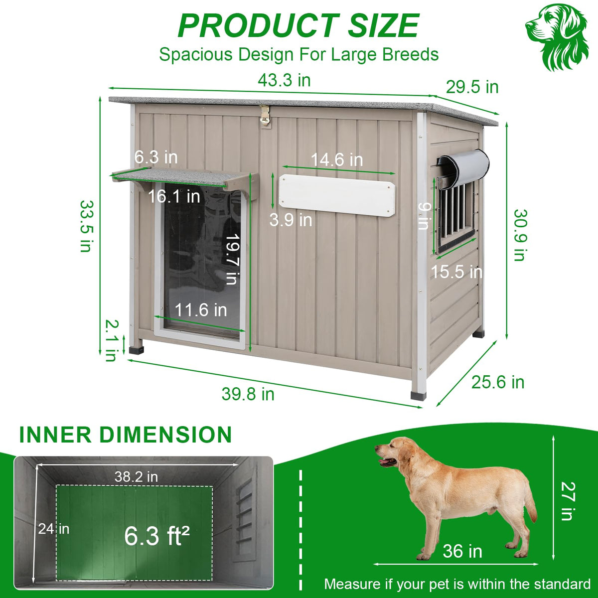 Give Your Dog a Safe & Cozy Retreat - All Year Round Crafted from durable, weather-resistant wood and reinforced with a chew-proof iron frame, this outdoor dog house offers your furry friend a secure and comfortable home in any season. The adjustable vent window ensures proper airflow during summer, while the elevated and removable floor keeps your pet warm and dry in the winter. Easy to assemble and designed for medium to large dogs, its more than just a kennel-its a haven of comfort your dog will love.