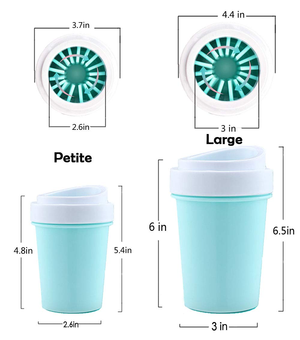 Q: What sizes are available for the Dog Paw Cleaner?A: The Dog Paw Cleaner is available in two sizes: Small/Petite, which is 5.4 inches in height and 3.7 inches in diameter, suitable for dog paws that are 1.5 to 2.3 inches wide; and Large, which is 6.5 inches in height and 4.4 inches in diameter, designed for dog paws that are 2.5 to 3 inches wide.