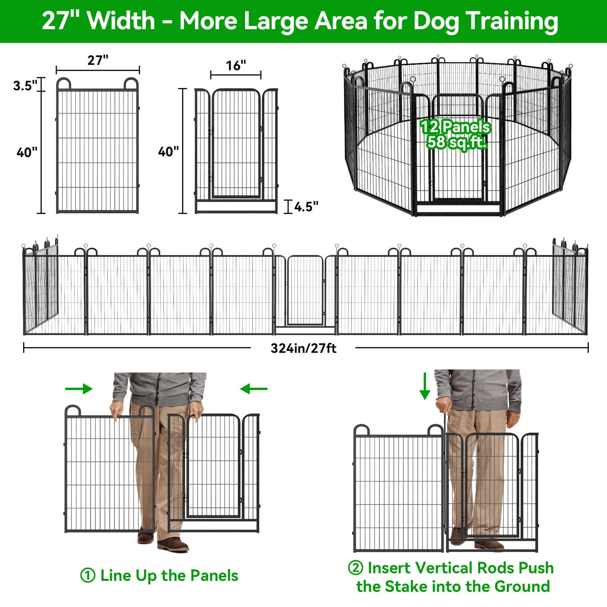 Dog Playpen Outdoor 12 Panels Heavy Duty Dog Fence 40'' Height Anti-Rust With Doors Portable For Rv Camping Yard, Total 27Ft, 58