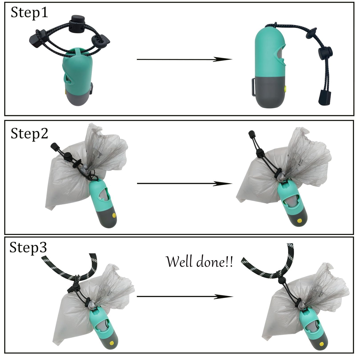 3 ACCESSORIES TO CHOOSE: 1 elastic rope with 2 buckles 1 metal carabiner and 1 hook and loop fastener.You can choose any one you like to meet personal needs.The elastic rope can be used to attach the dispenser to a dog walking leash as well as to clip used poop bags.No need to hold it in your hands until you find the trash can