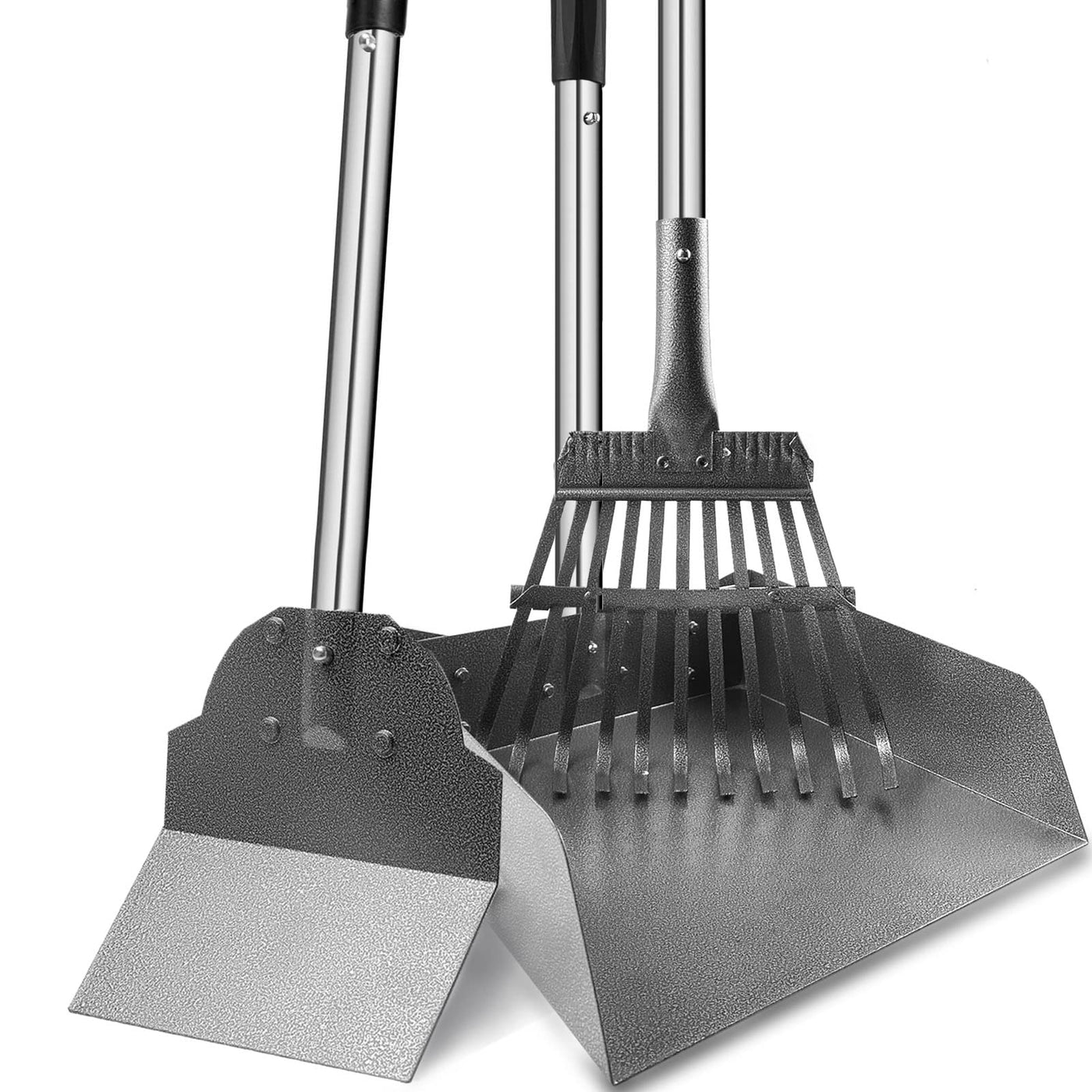 Dog Pooper Scooper For Large Dogs, 3 Pack Adjustable Long Handle Metal Tray, Rake And Spade Poop Scoop With Bin For Pet Waste Re