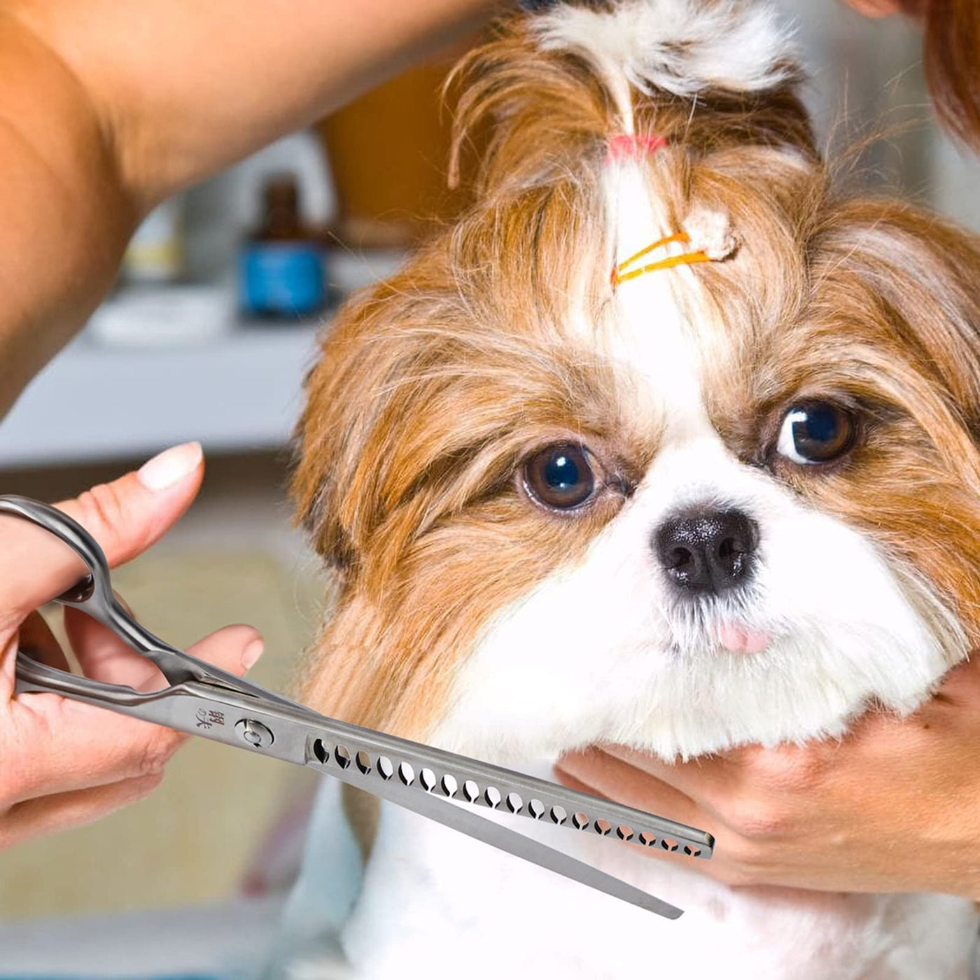 Q: What materials are used in the Dog Professional Grooming Scissors?A: The Dog Professional Grooming Scissors are made from high-quality 440C stainless steel, which is solid, rustproof, and ensures a sharp cutting edge that lasts over time.