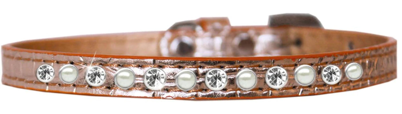 Add sophistication and elegance to your fur baby's wardrobe with a dazzling Designer Croc collar! This collar is a faux leather, and available in multiple collar colors, and an array of sizes. These beautiful collars are ?" wide and feature one row of & alternating pearls and clear crystals. Great for small pets.